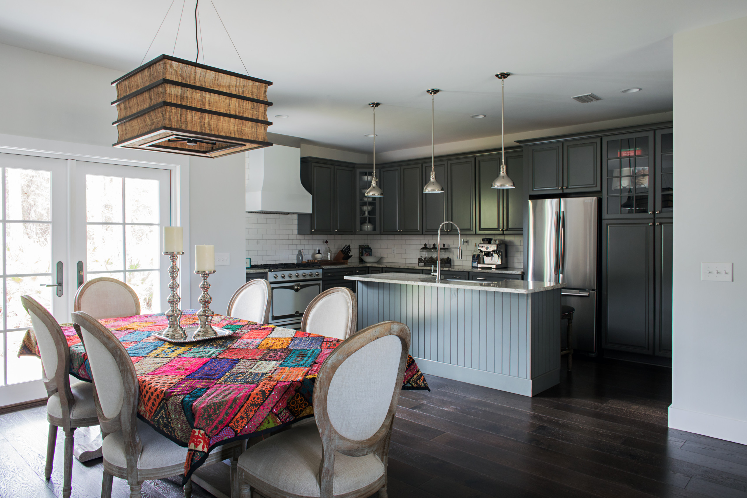 European white oak flooring adds to the home’s farmhouse appeal and connects the dining area and kitchen. The kitchen’s Shaker-style KraftMaid cabinets and island are painted a gray shade called Greyloft, with a sable-colored glaze. For the island’s wainscoting, the same color was used but less sable glaze applied, producing a lighter shade. The dining table is from a furniture store in Georgia, where Mary Beth’s parents live.