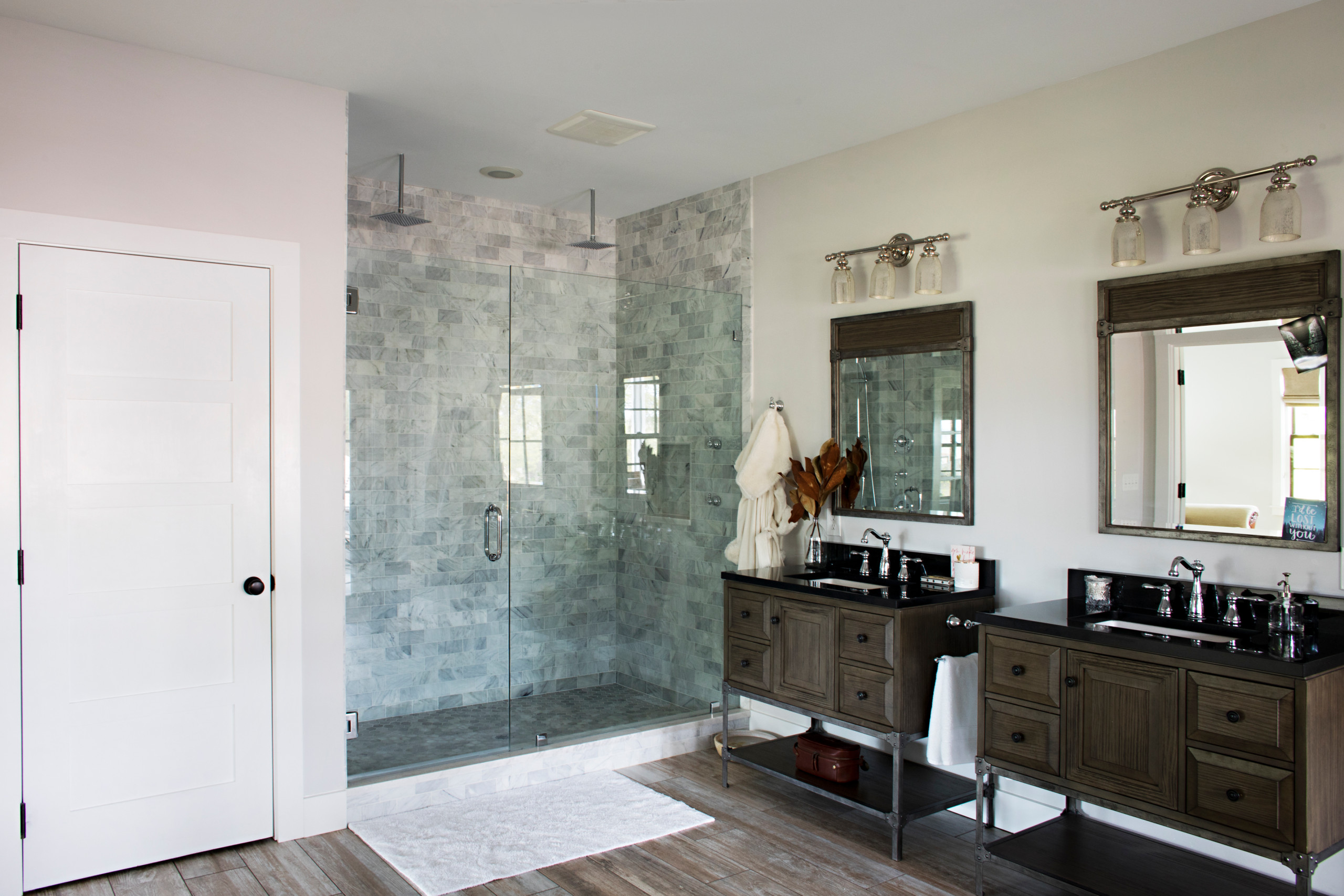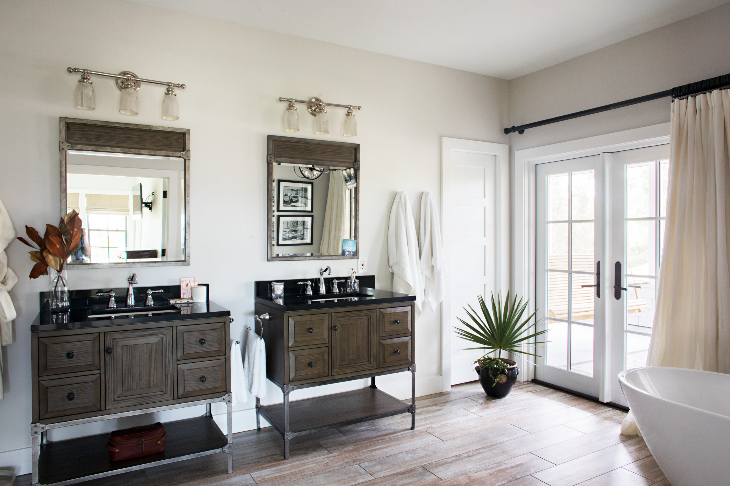 The master bathroom is the couple’s second-floor splurge. The freestanding tub is the big-ticket item. The roomy space features two large vanities and mirrors that evoke an industrial farmhouse feel. The double French doors lead to the screened-in porch.