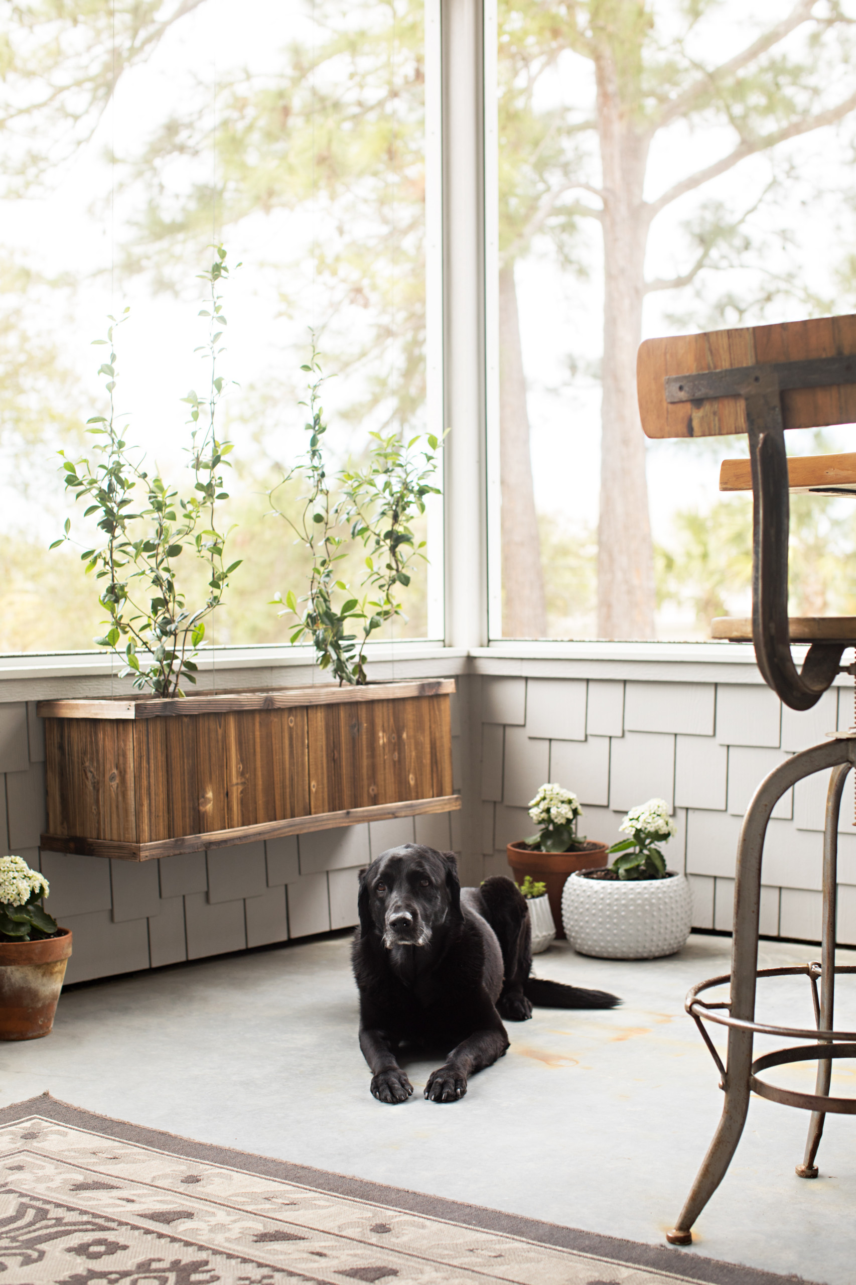Here’s Stubbs, the Tatums’ 13-year-old black Labrador, enjoying the porch. She’s showing signs of age, says Mary Beth, but still loves the water and fetching sticks at a nearby park.