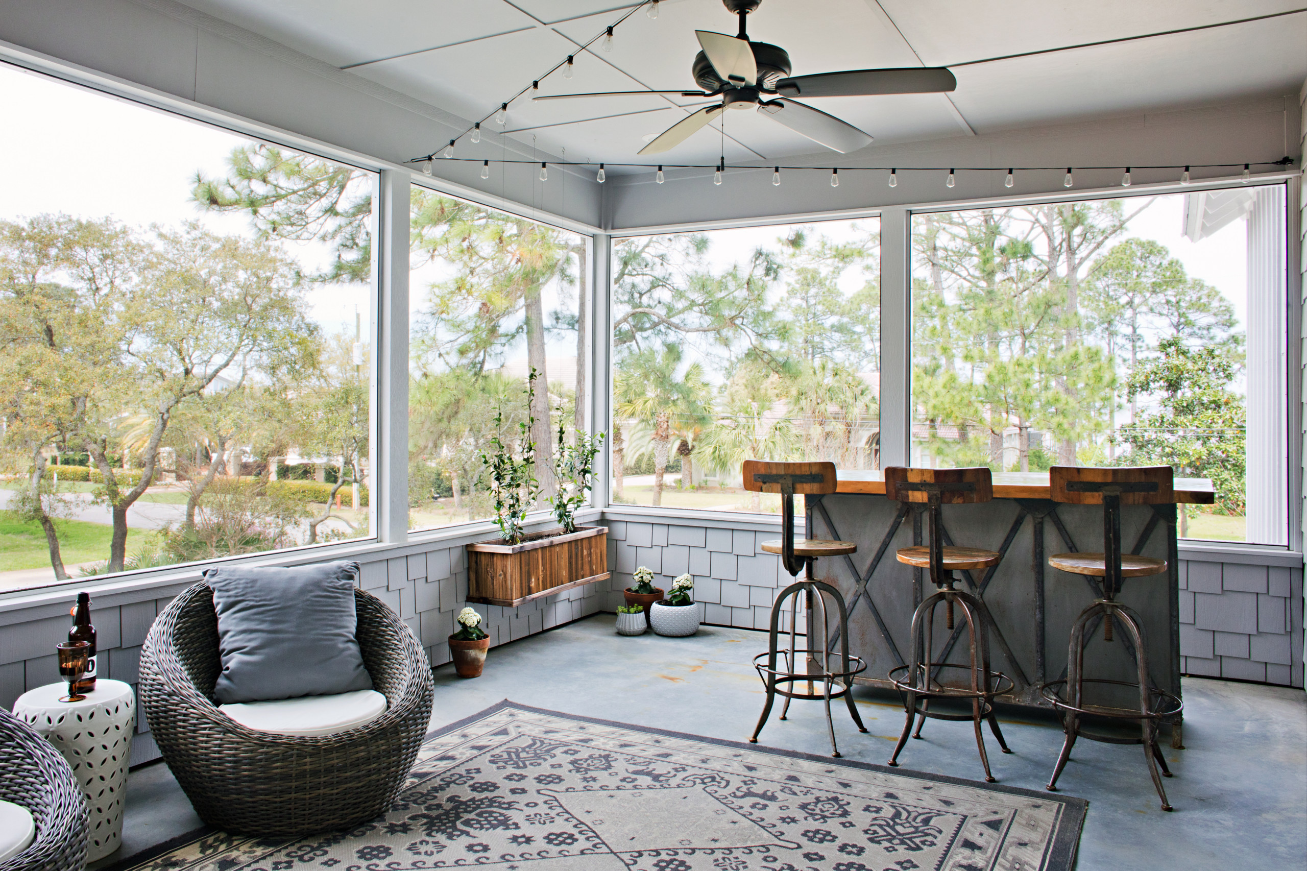 The porch has a bar with industrial-style stools and a separate seating area. The flooring is concrete. The outdoor rug is from a patio store. “It had been on the floor as display for years, so we got it for a bargain,” Mary Beth says.