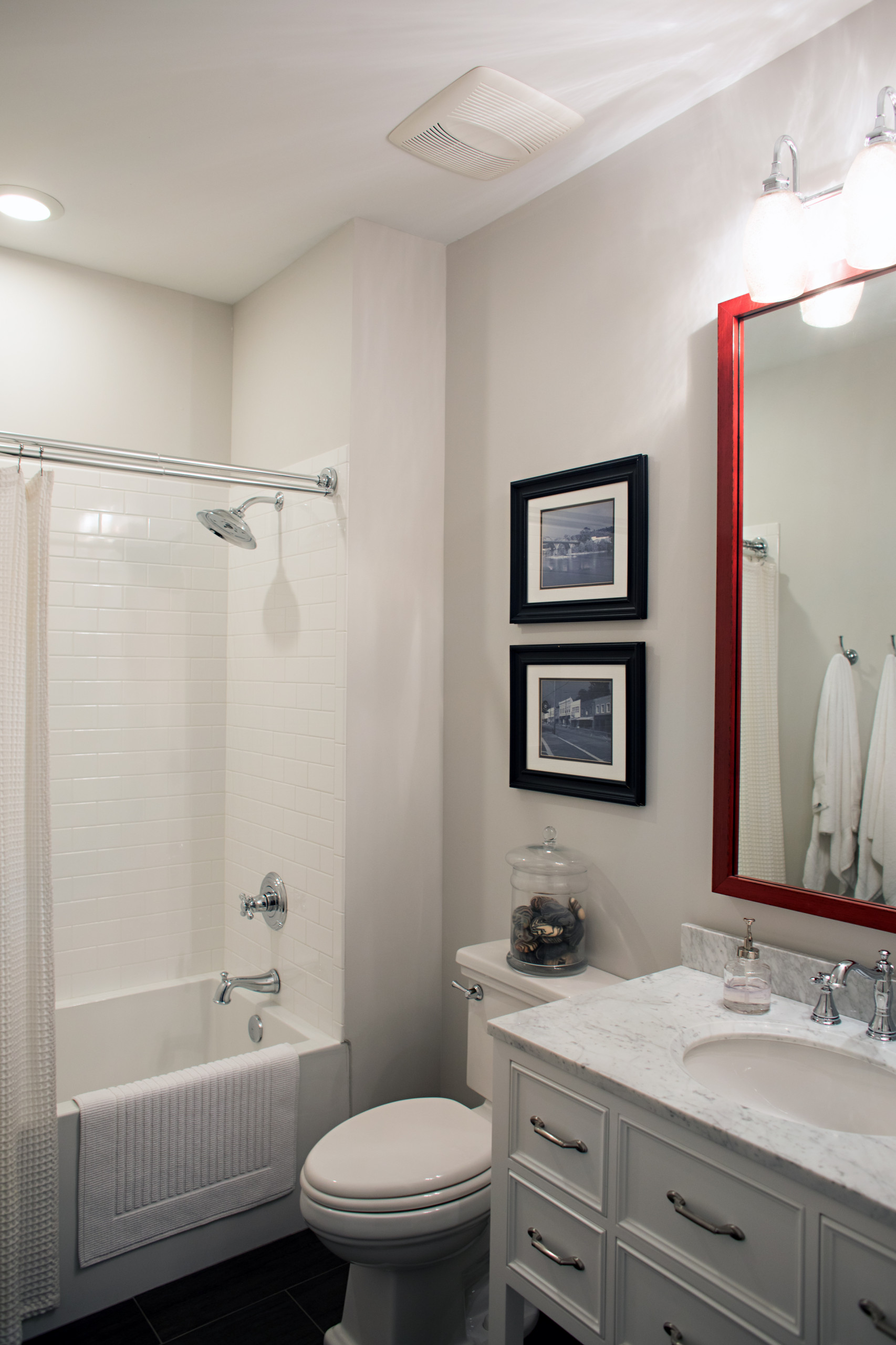 A guest bathroom located between the two guest bedrooms features a white vanity topped by a marble counter.