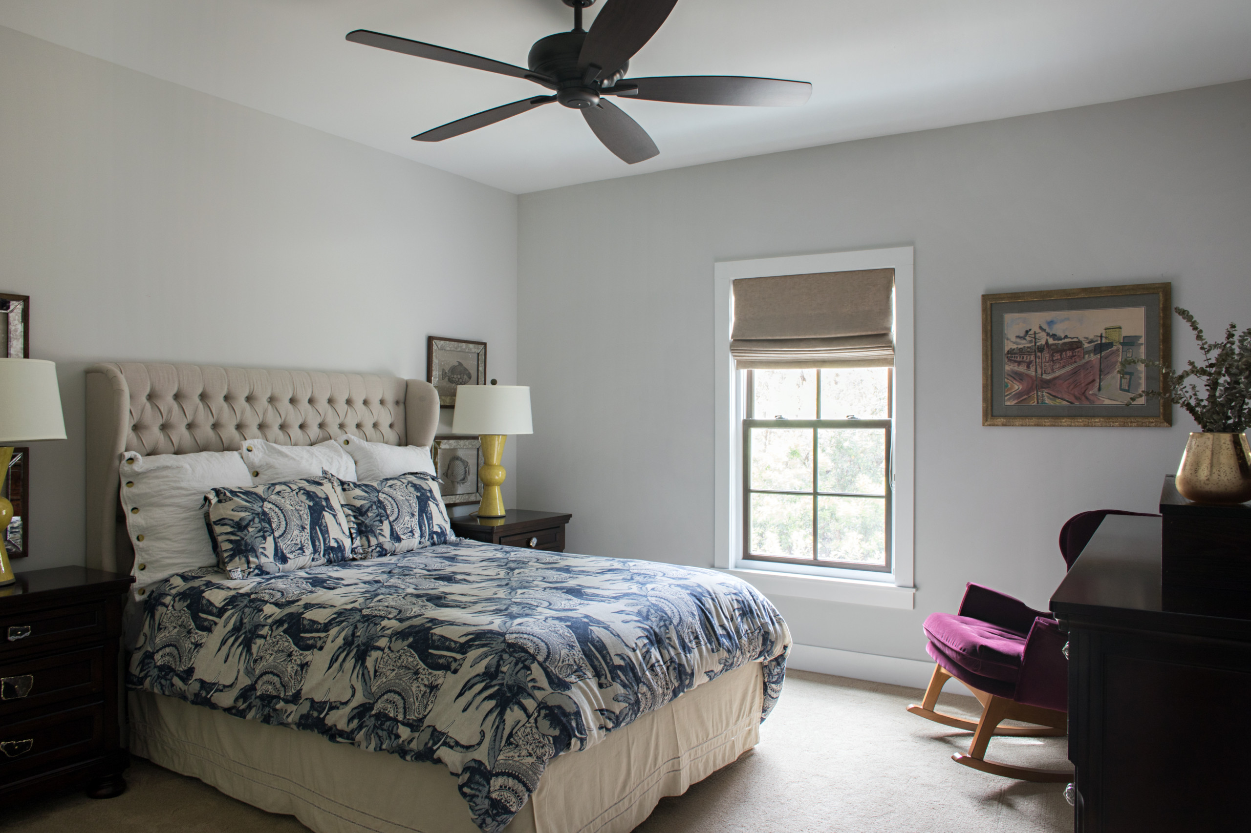 One of the guest bedrooms has a coastal feel, thanks to the blues, whites and tans in the bedding, tufted headboard and linen shade. Yellow bedside lamps and a purple velvet rocker from Anthropologie add splashes of color.