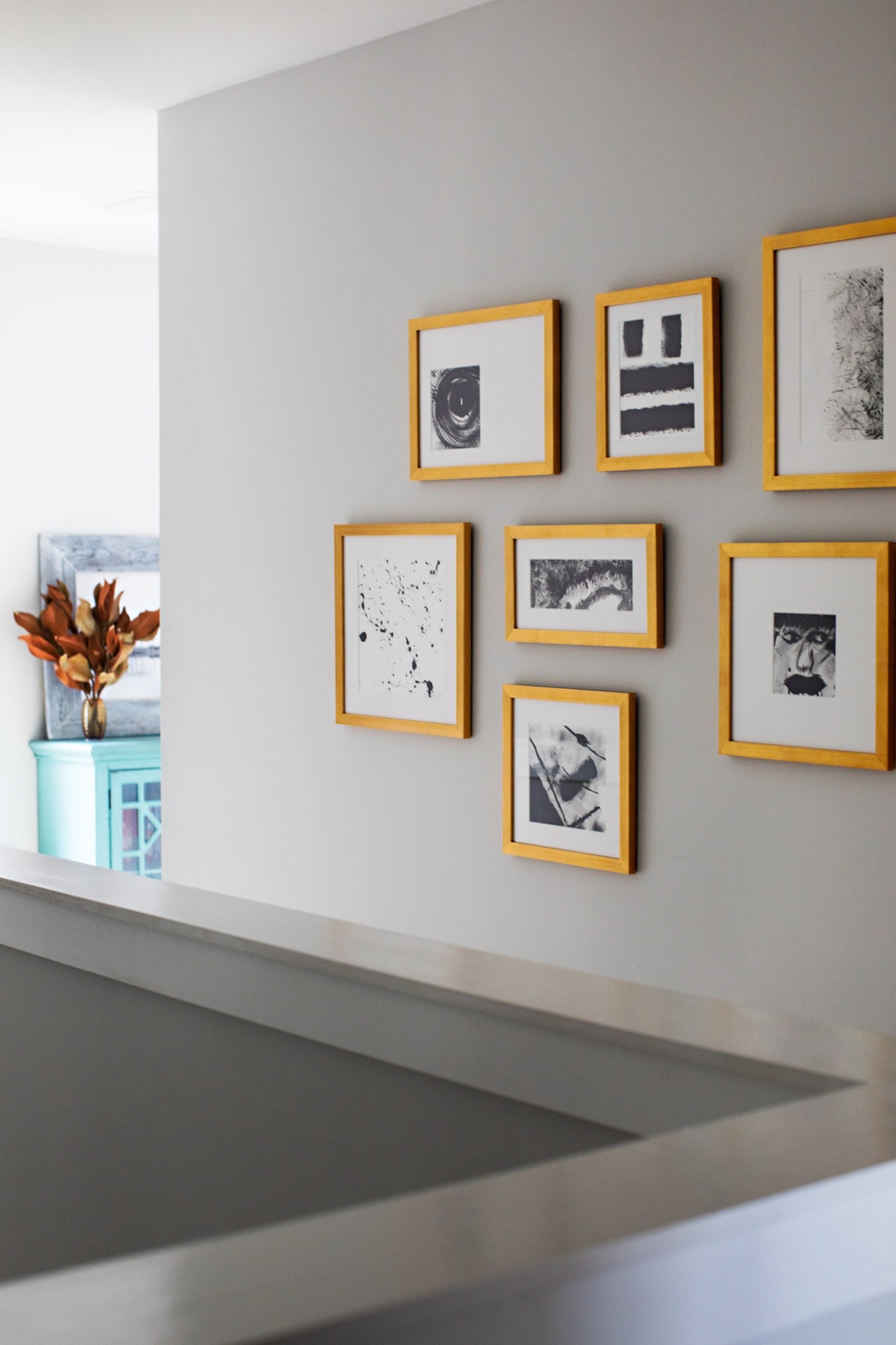 The couple framed architectural drawings from local home design store Stock & Trade Design in similar frames. They’re displayed in a line horizontally for a symmetrical design effect.