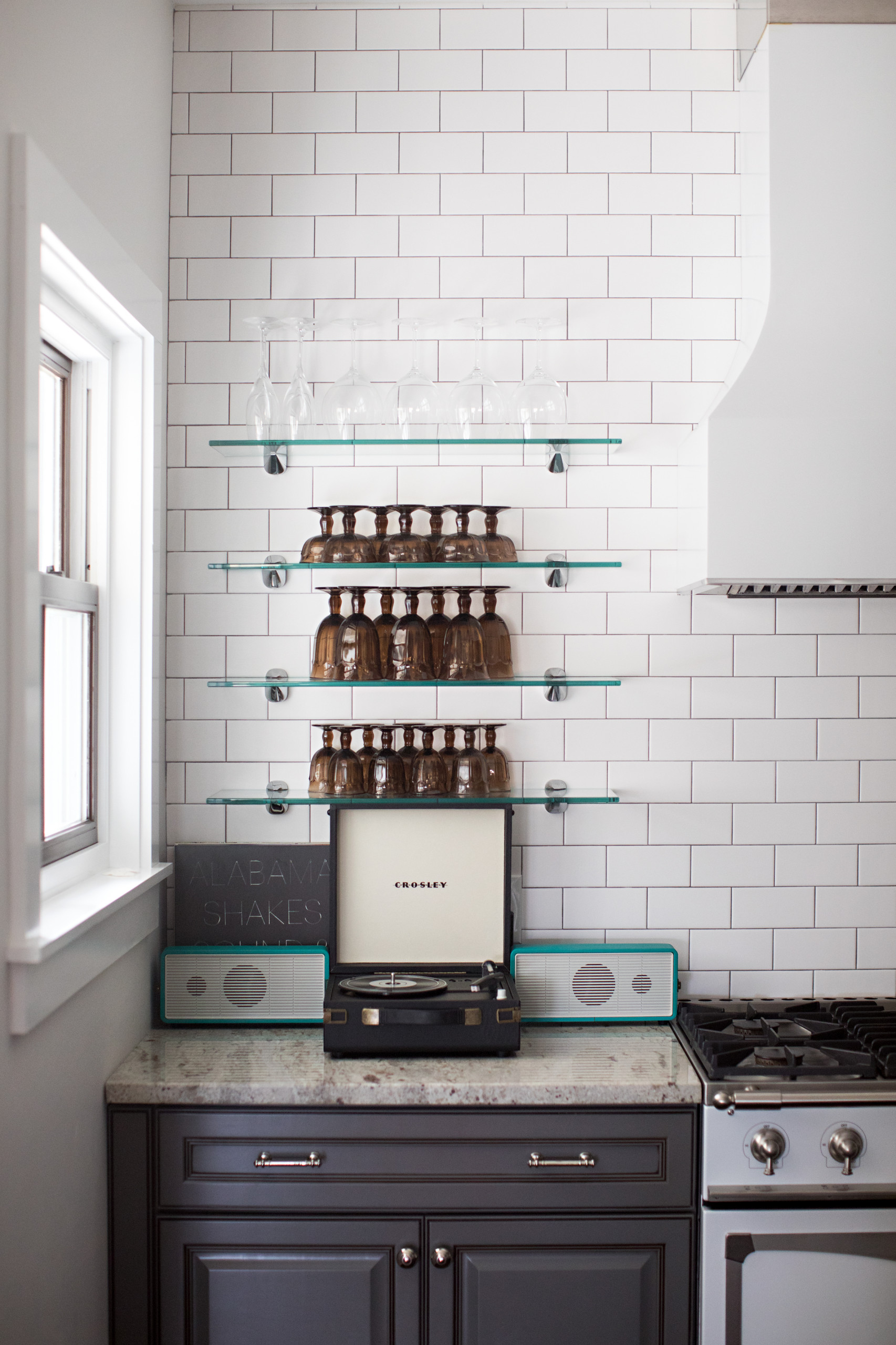 The couple enjoys dancing to jazz, soul and alternative music played on the Crosley record player located on the granite counter next to the range. The glasses on the shelves belonged to Mary Beth’s grandmother. The white subway tile used for the backsplash has a matte finish.