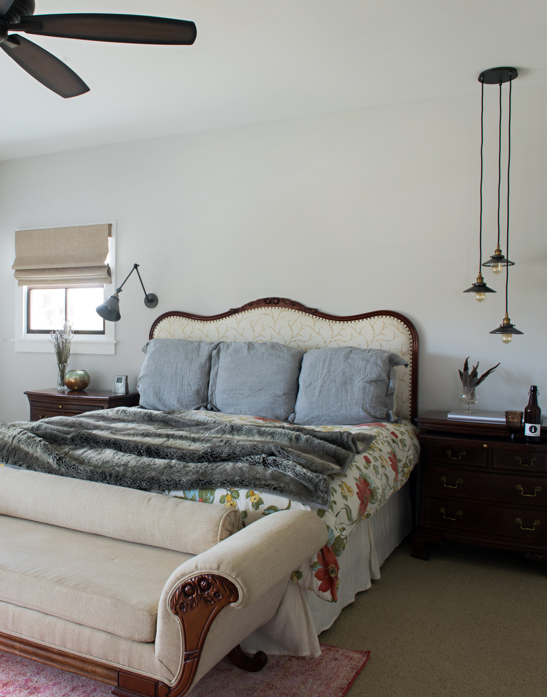 In the master bedroom, the couple transformed an heirloom into two new pieces of custom furniture. They took a couch that belonged to Mary Beth’s grandmother and turned it into a headboard and bench by deconstructing, staining and reupholstering it.