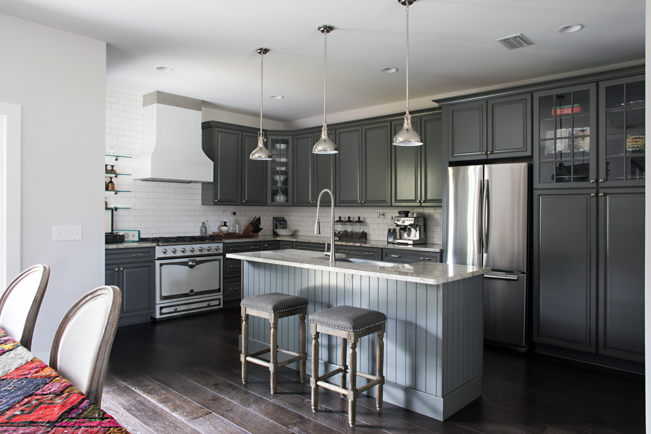 Even though Mary Beth doesn’t cook (though Josh does), when she saw a photo of a La Cornue range in a magazine, she fell in love with it. The handsome 36-inch CornuFé range’s light color and dark trim inspired the palette for the rest of the kitchen and first floor. “I felt comfortable going with darker cabinets against the white range,” Mary Beth says. “It was the first thing I had in my mind visually, and I created around that.” The range hood is custom-made.