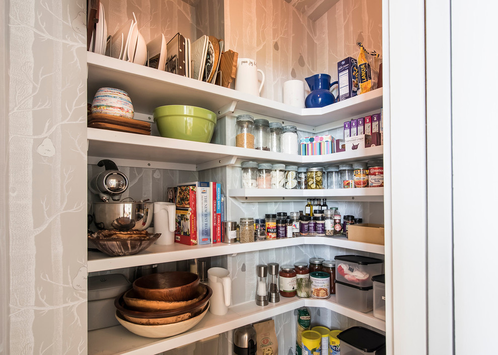 Clad in a woodland-inspired wallpaper, the pantry is characterized by its simple design with mostly shallow shelving. An inset area provides enough space to store bowls and cookbooks.
