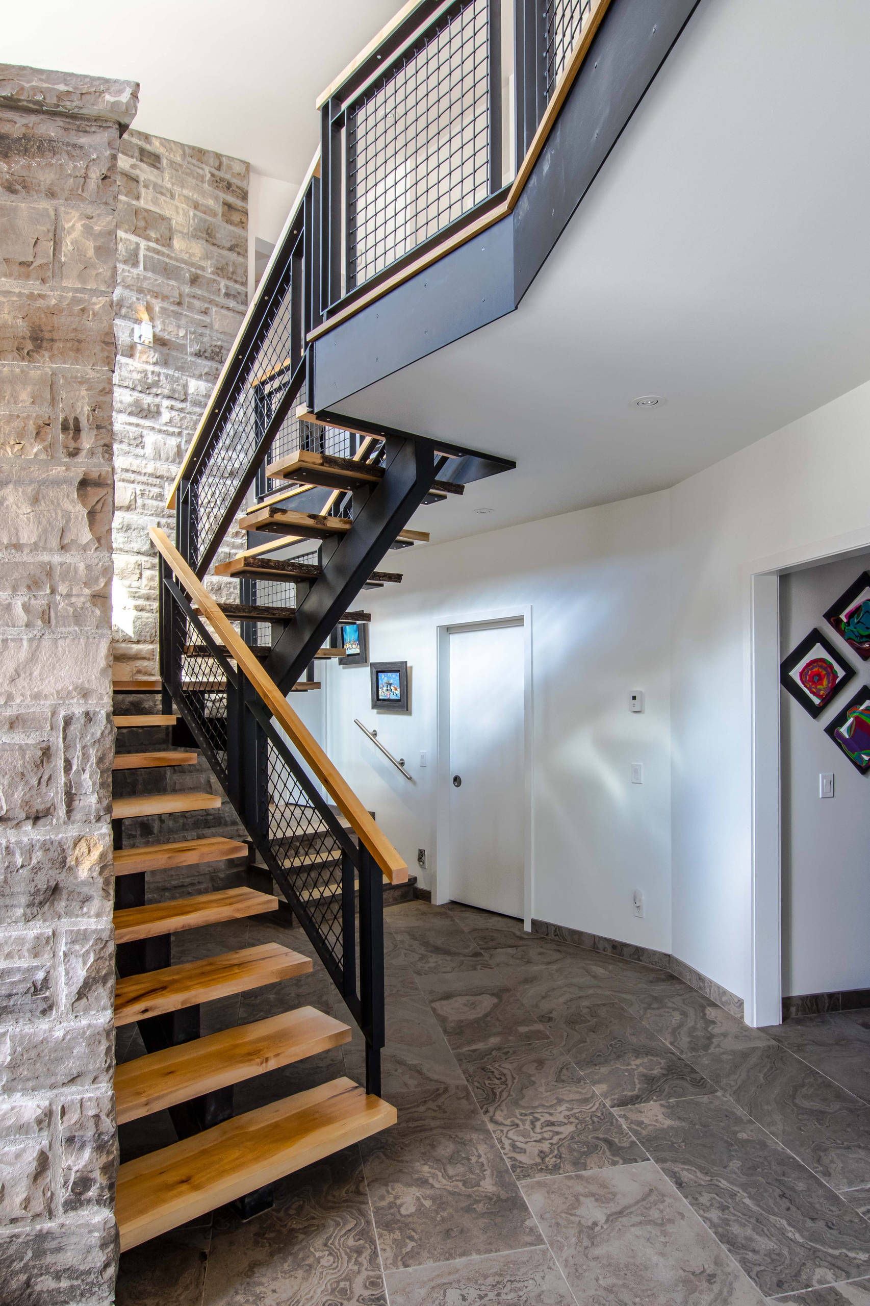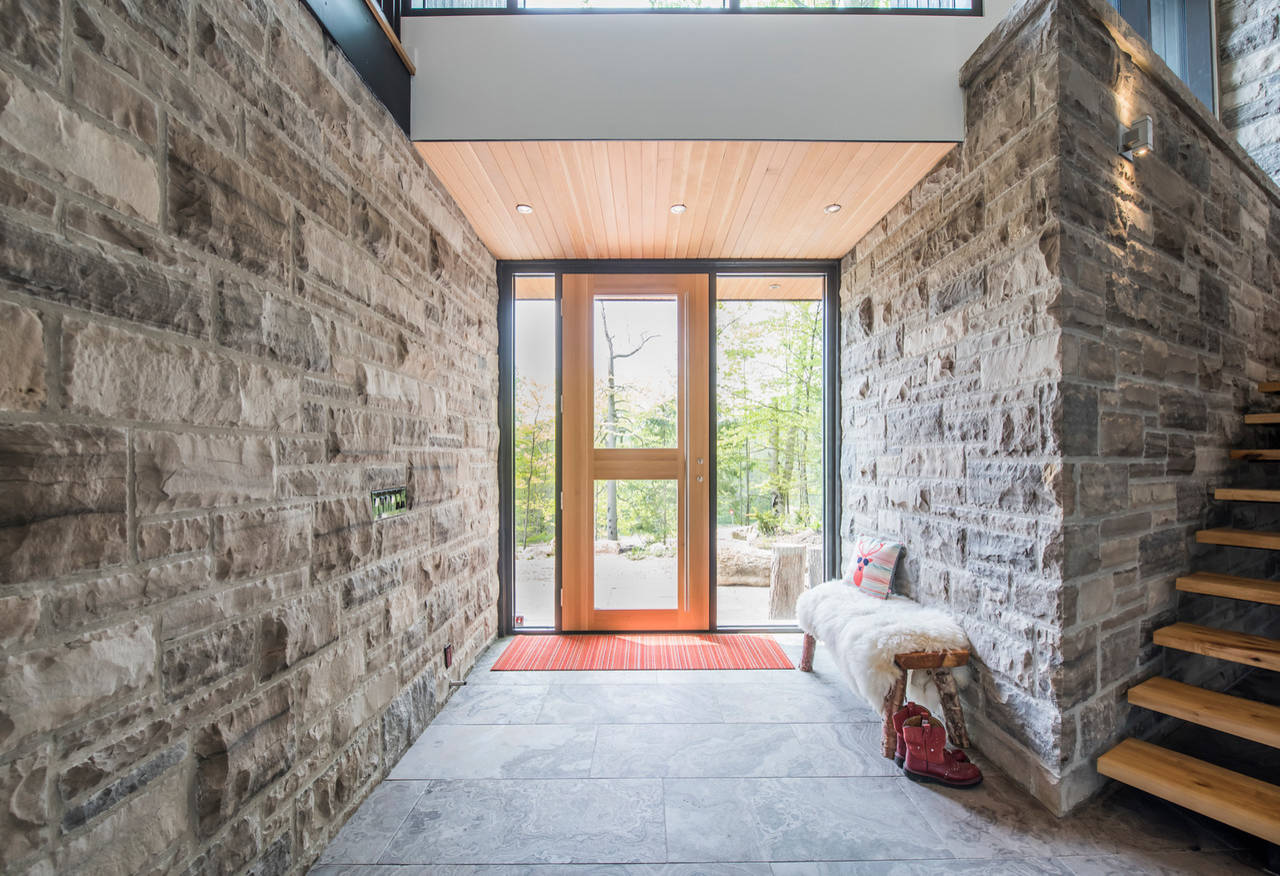 The cedar soffit and rough-hewn stone continue from the exterior of the home into the front foyer, pulling you through the hall and to the stairway leading to the great room. The flooring is made of a locally quarried stone named Eramosa, durable enough to withstand the ski boots that traverse the hallways all winter.