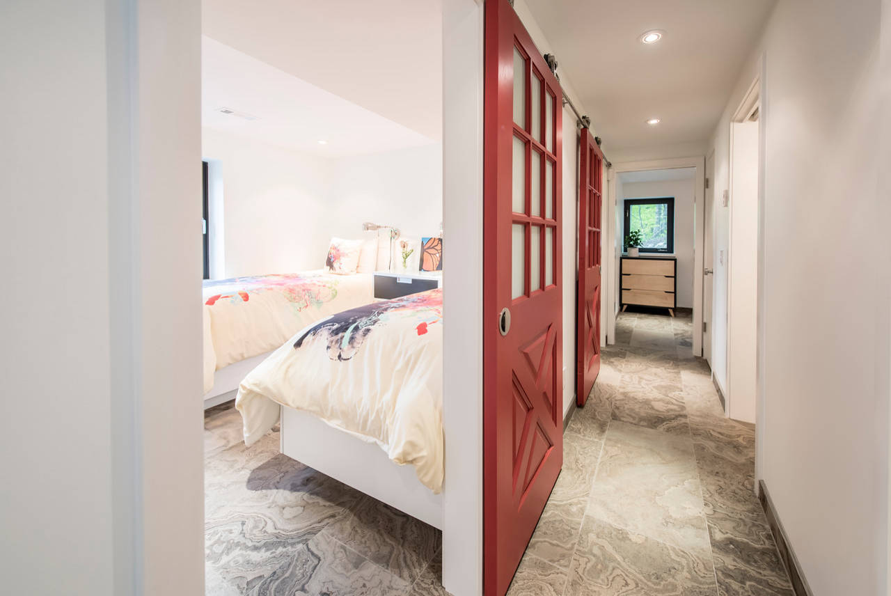 On the ground floor, the hard-wearing Eramosa stone continues into the children’s bedrooms. The red-painted doors were part of the original cottage, and were salvaged and refinished for use along the length of the private hallway. They’re a bright reminder of the children’s grandfather and the wonderful legacy he helped create while at the chalet.
