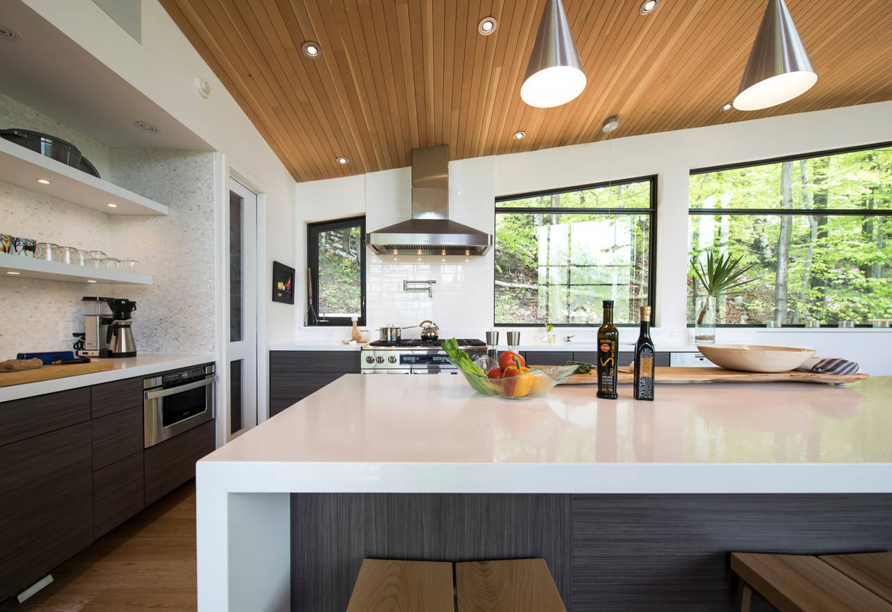 Tucked into the trees, the second-story great room makes clever use of a shed roof that pitches upward toward the windows, drawing the eye out to the nearby mountain views. The crisp, clean white walls and the hardwood flooring are tempered by heavy wooden beams and a cedar-lined ceiling. The overall effect is warm and slightly rustic, but very refined.