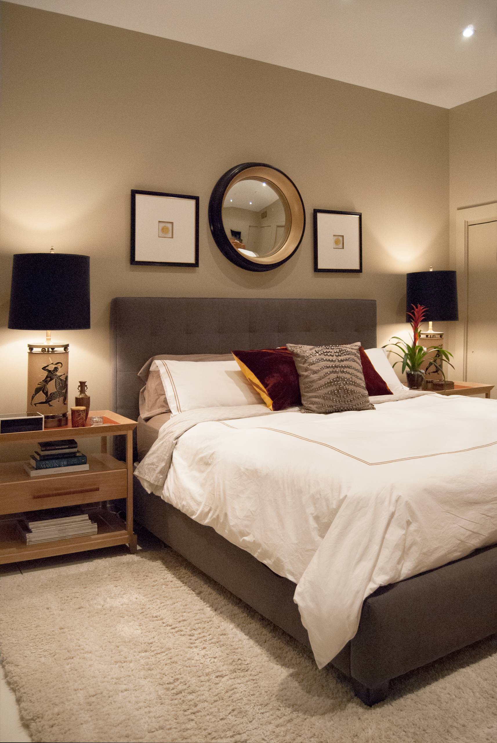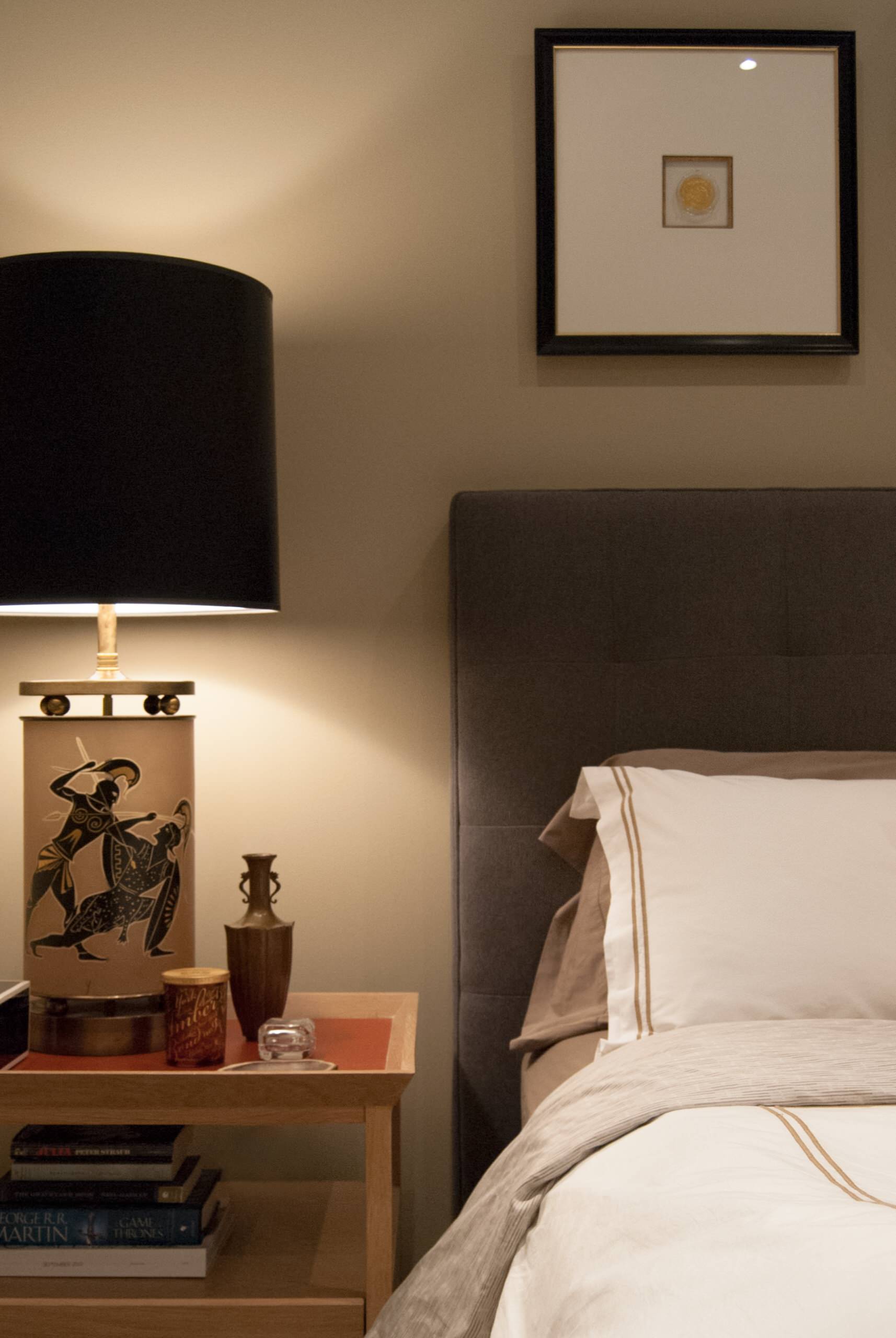By incorporating elements such as an upholstered bed frame and wooden side tables, the duo softened the lines and created masculine yet comfortable sleeping quarters.