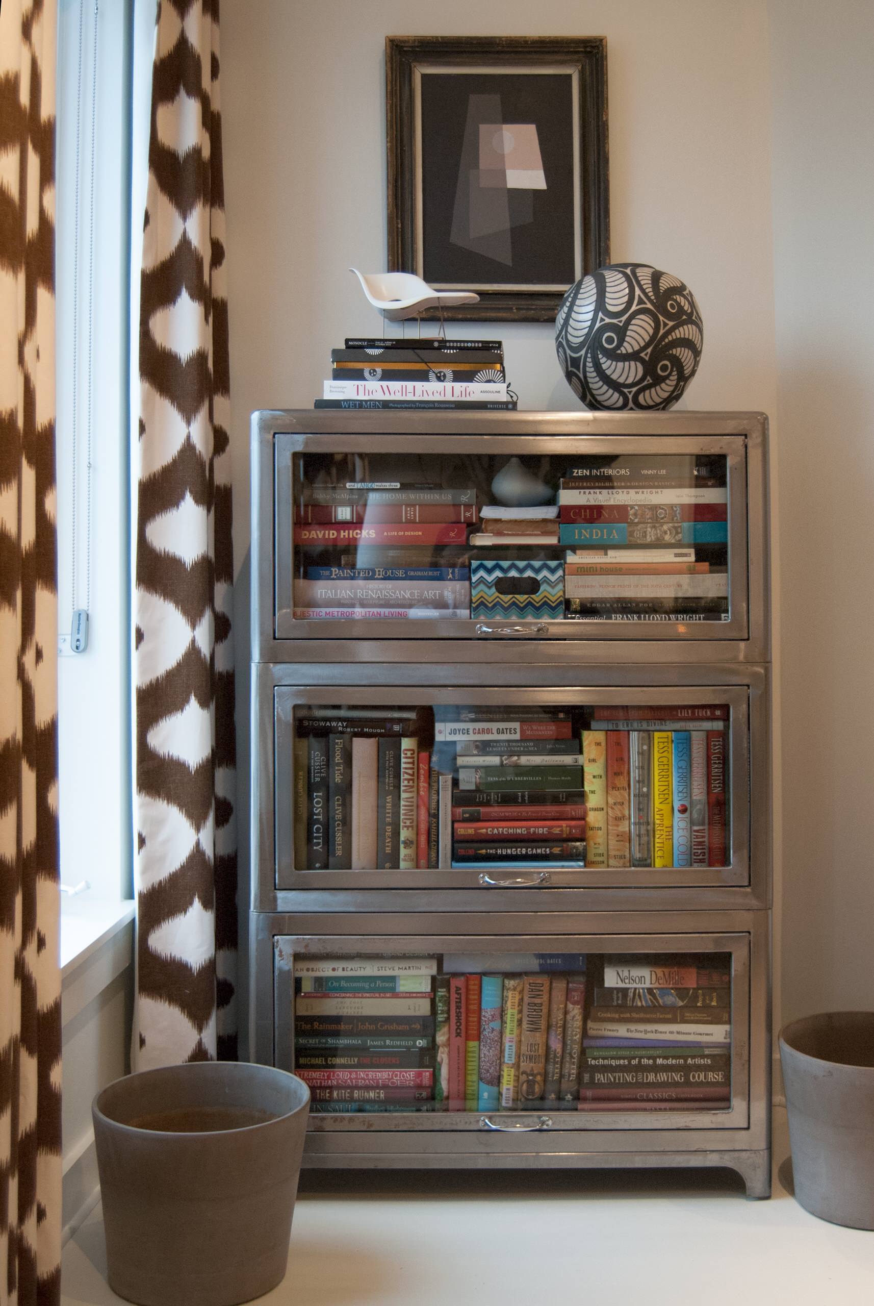 A steel barrister houses Adamik's library of design books and other finds, including a miniature Eames La Chaise Chair from Design Within Reach.