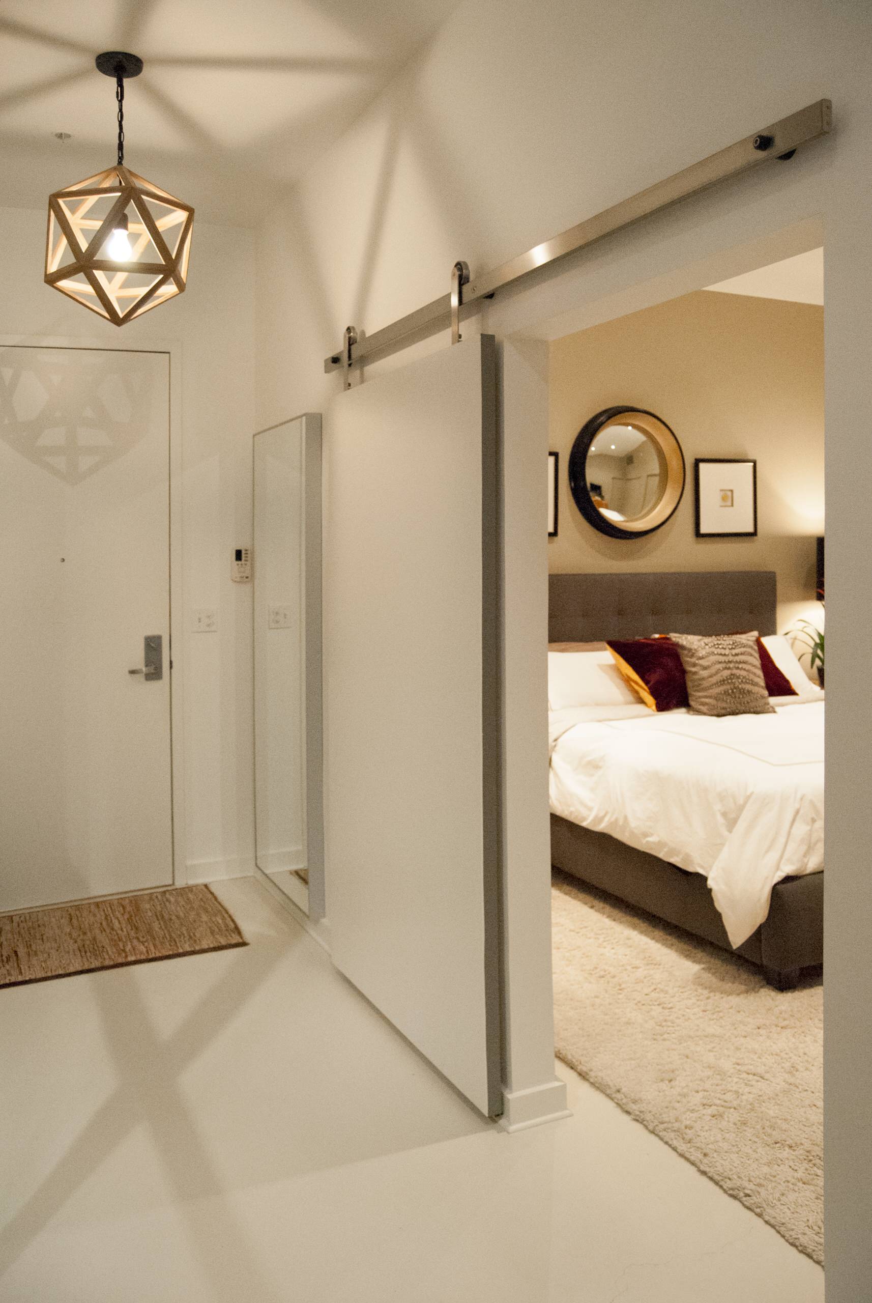 Door hardware: Barndoor Hardware; door paint: White Heron, Benjamin Moore; pendant light: Visual Comfort