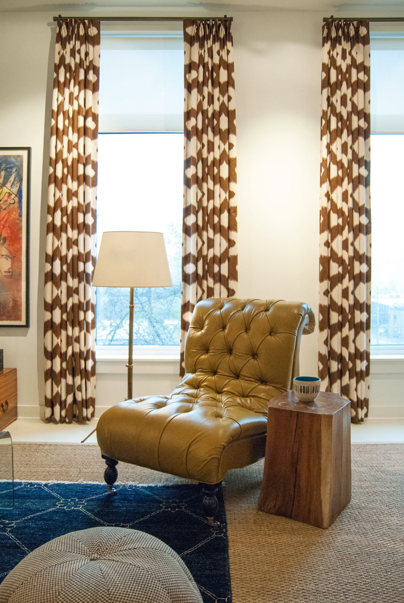 An animal hide on tightly woven sisal covers the home office floor. "The room is an odd shape, so doing an area rug was not going to work," Adamik explains.