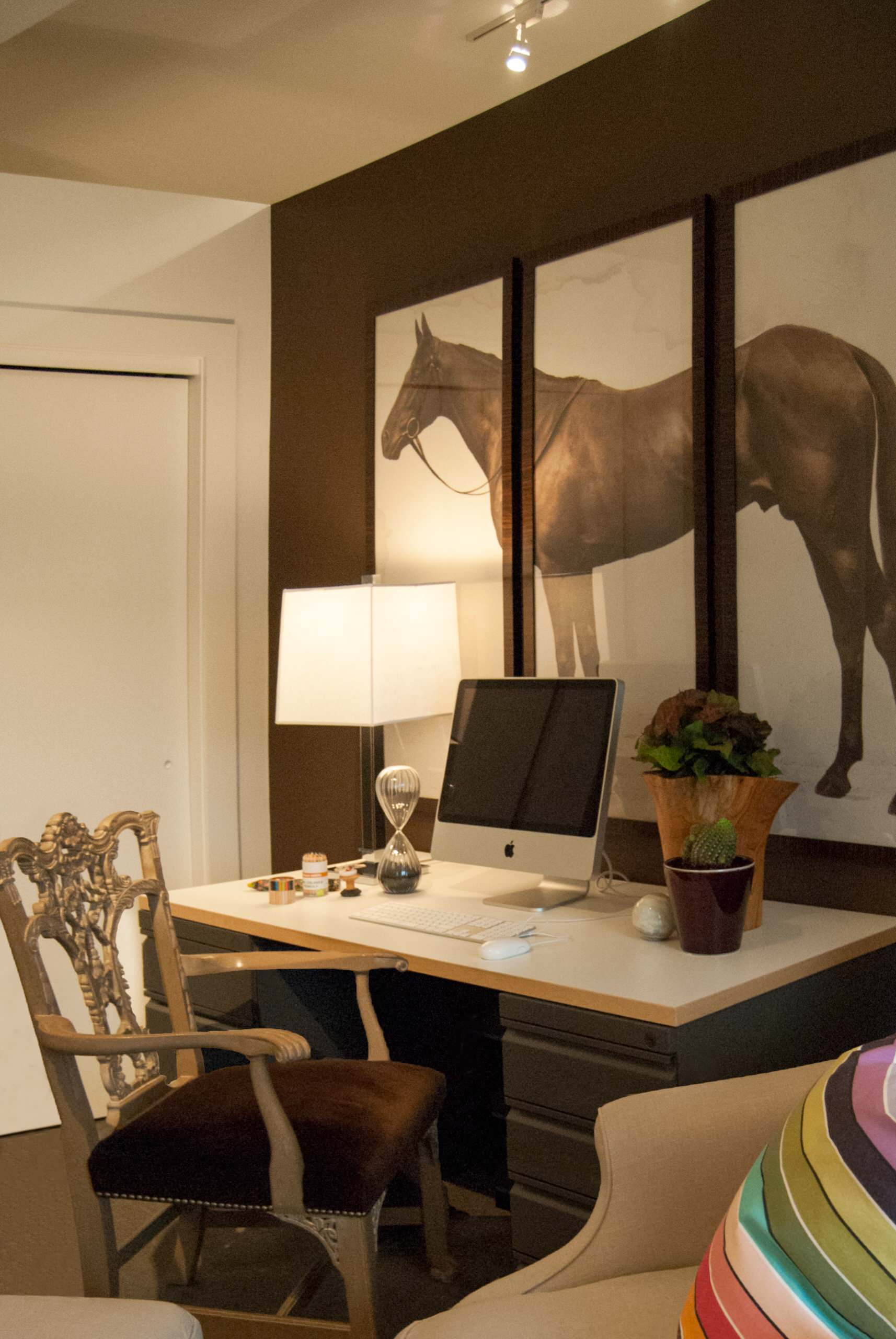 For the work area in the office, Adamik and Charney opted for luscious brown from Ralph Lauren Paints. A massive triptych of a horse hangs above the desk, paired with a custom Hickory Armchair by one of Adamik's favorite designers, Thomas O'Brien.