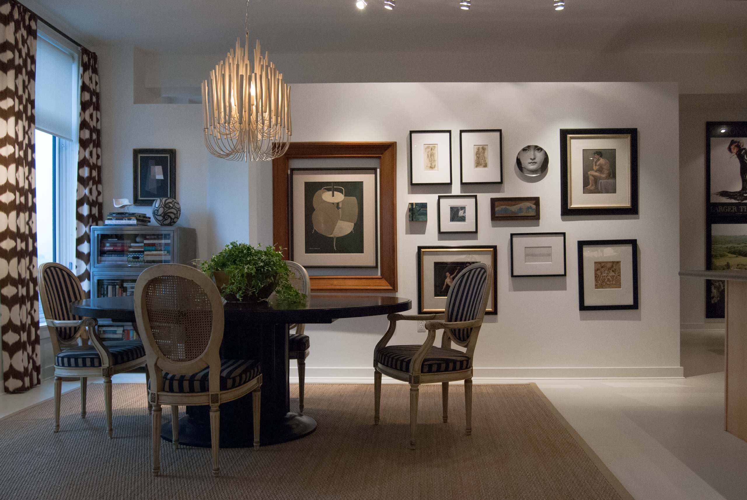 A Marcel Duchamp lithograph hangs in a double frame. The walnut-inlay frame was originally from a mirror that Adamik and Churney had hanging in their previous home. It had survived a fall that shattered the original antique silvered glass, and rather than trying to duplicate the effect, the couple gave the frame a new purpose.