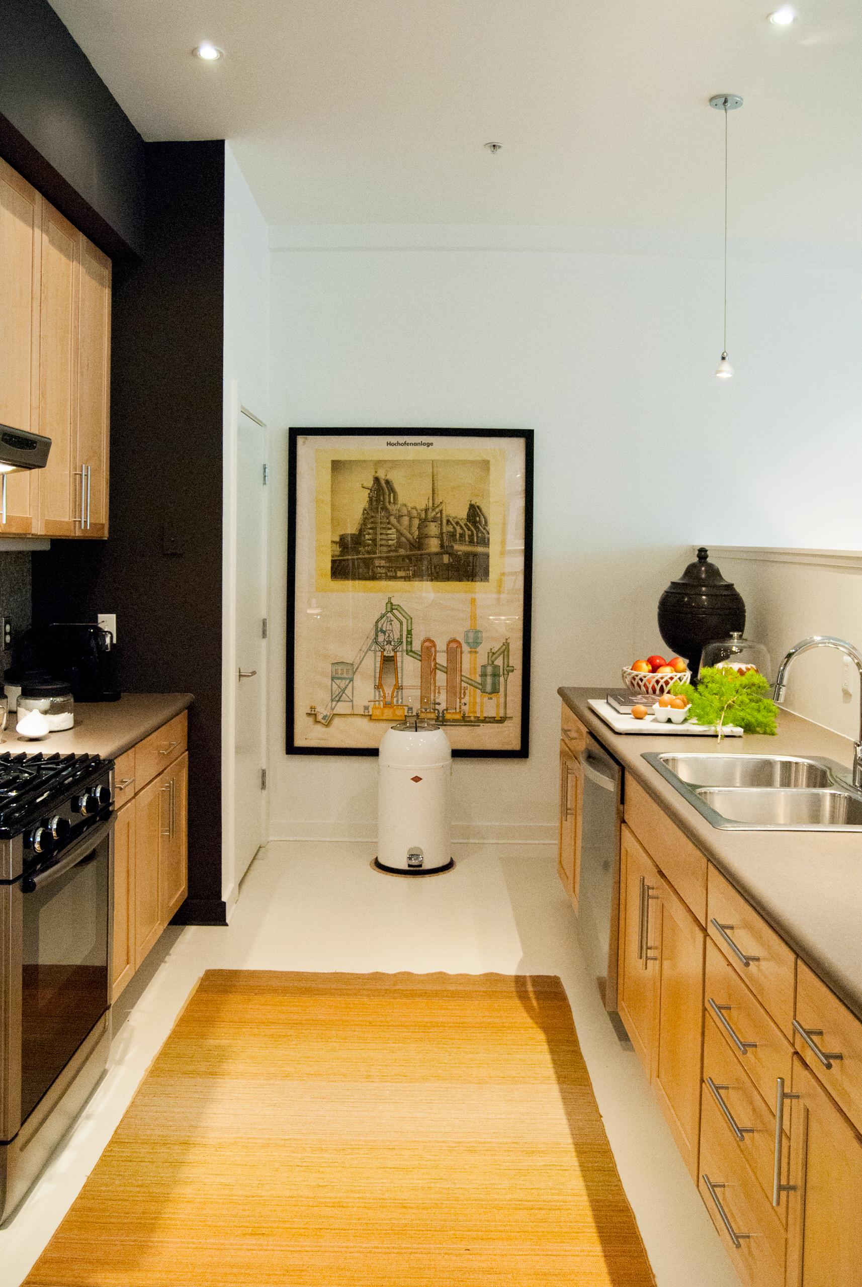 The galley-style space once opened to the living room, making furniture placement difficult. Adamik solved this by adding a dividing 5-foot-high wall that closes off the space yet still allows interaction with guests in the living room.