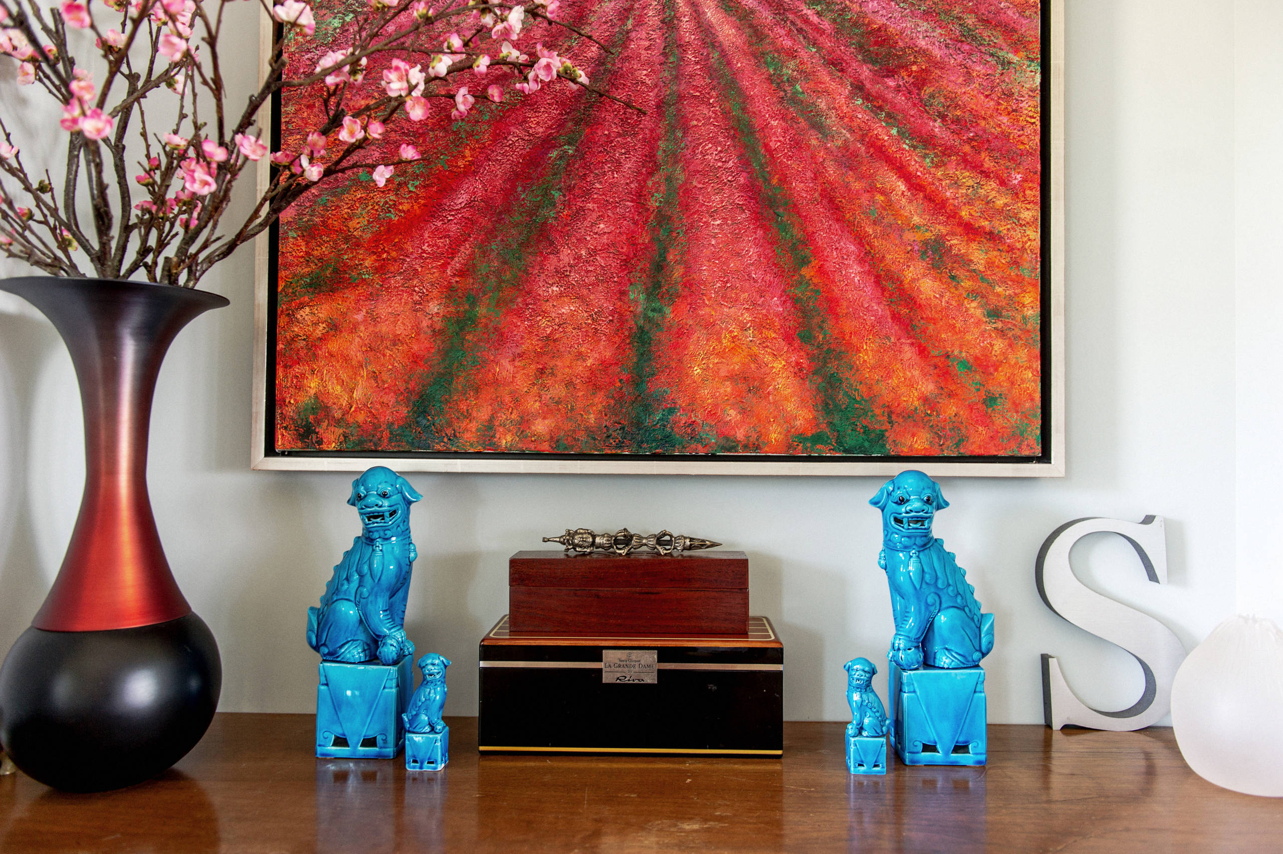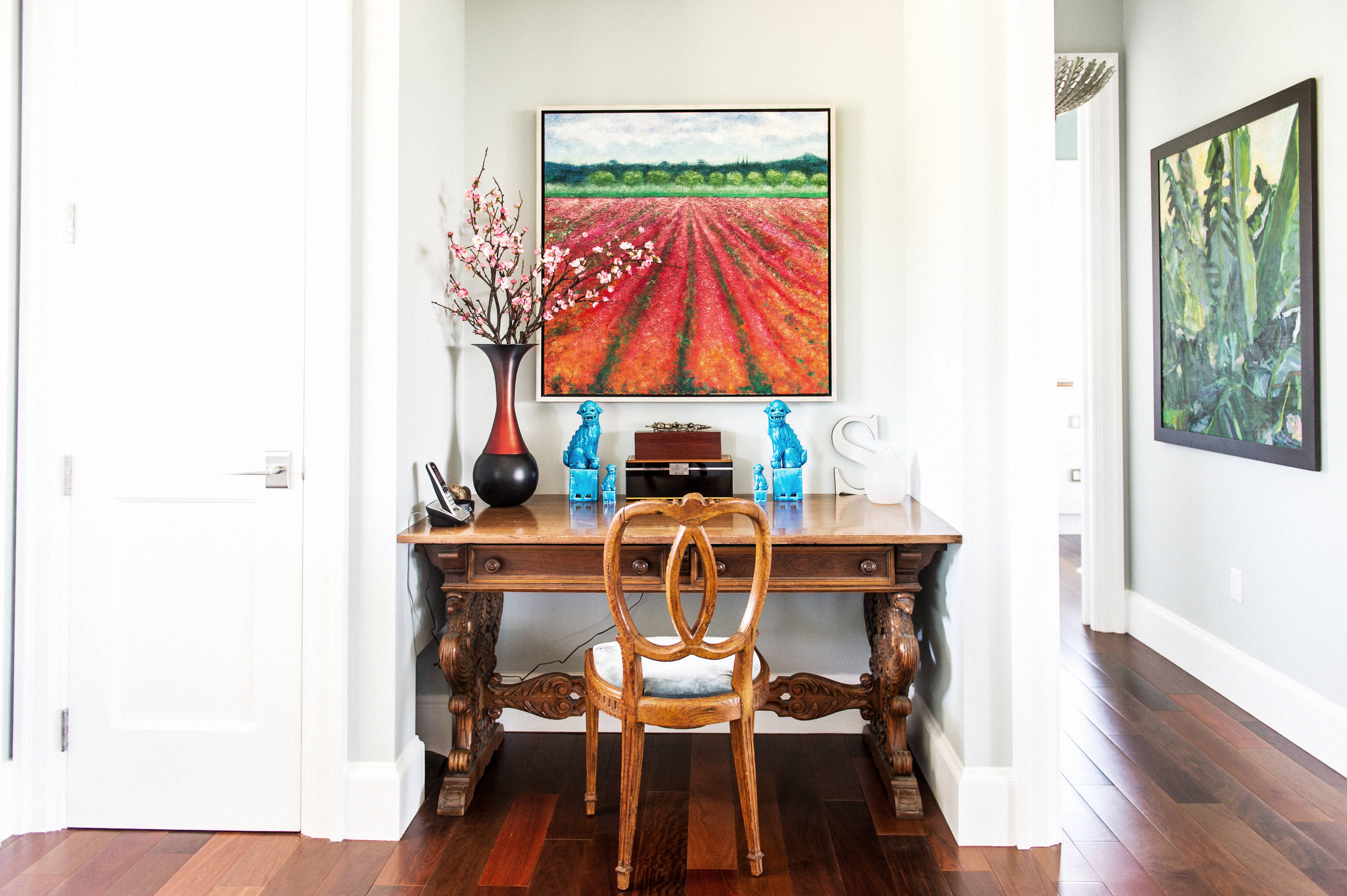An out-of-the way corner of the great room is home to an antique desk from a thrift store in New York. The foo dogs were found at the same store, and the painting was done by a friend of Schmidt’s from college, contemporary artist Marlena Chumo.