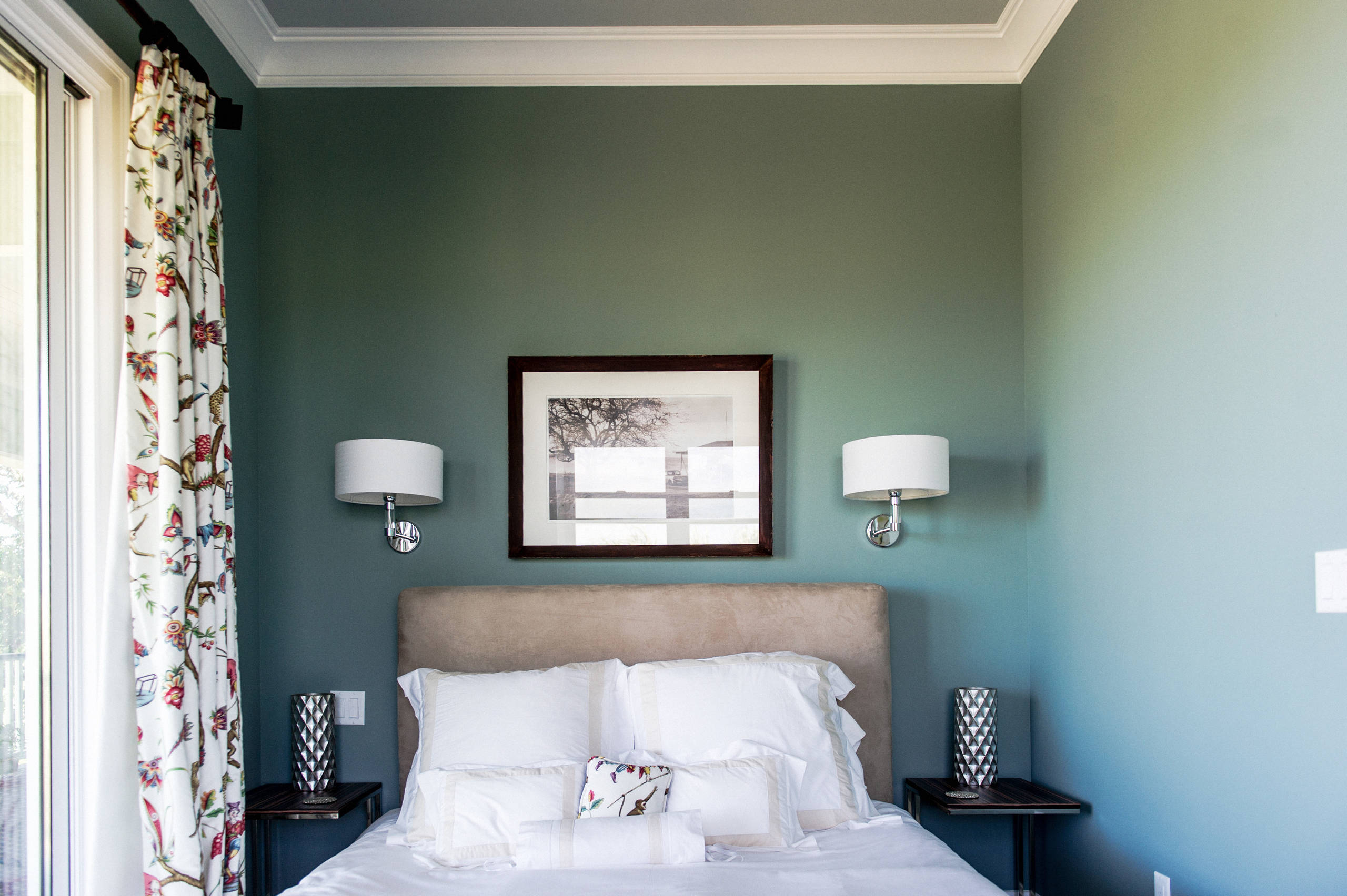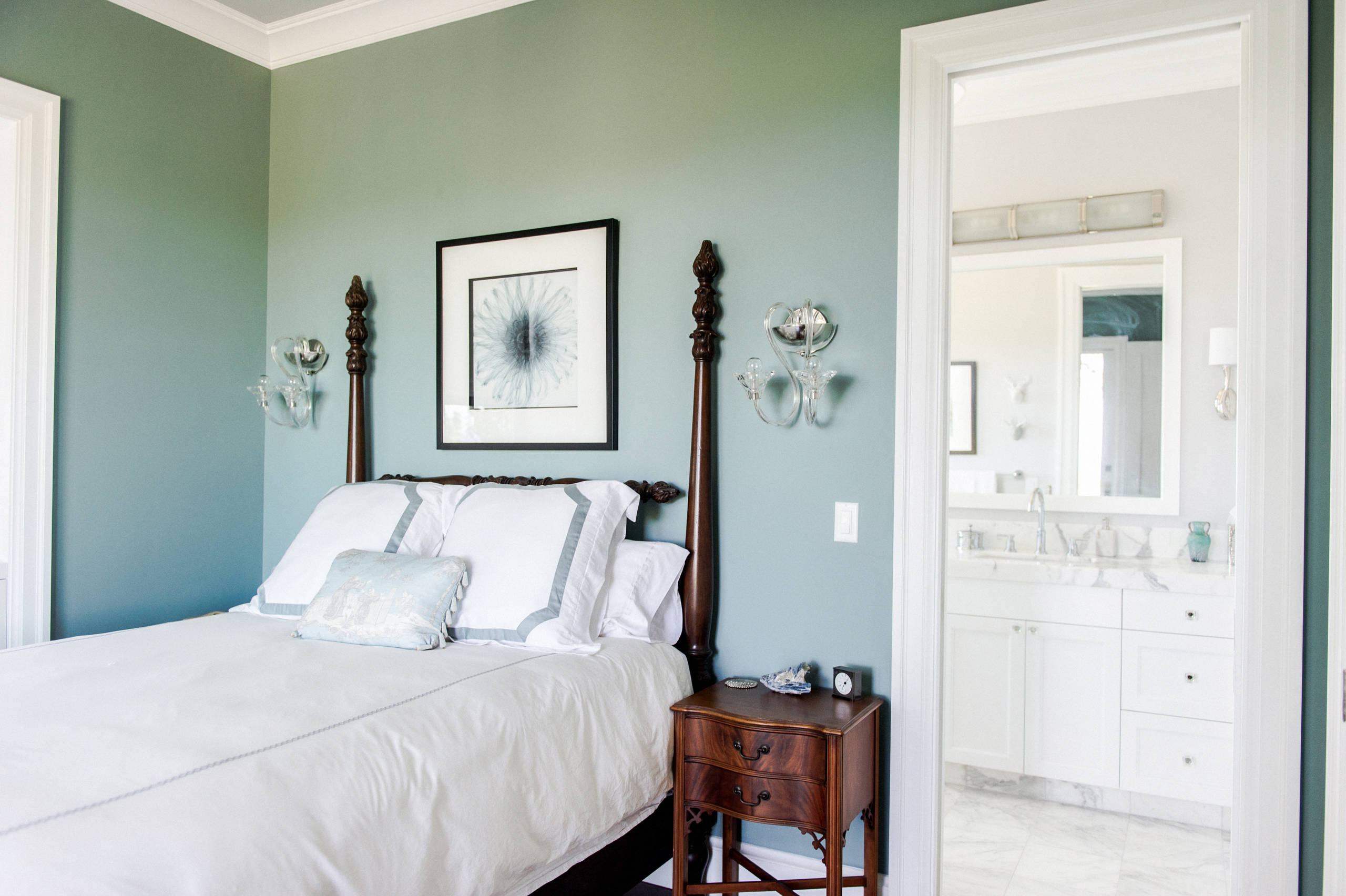 The master bedroom has ocean views across the tall cane grass. The walls are the same shade of blue as in the guest room, but other touches vary, including the jeweled chandelier and the window covering. Schmidt came across the white duck canvas shade lined in black with the perfect dimensions and style on the online consignment shop Chairish, for $100.