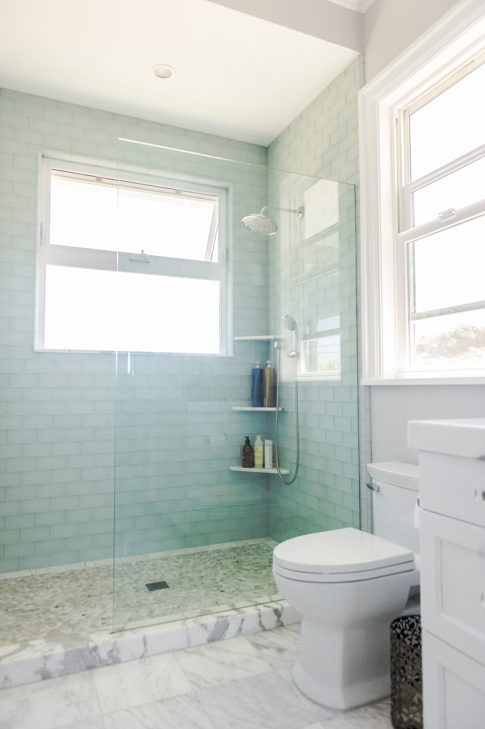 The shower features 3- by 6-inch matte subway tiles by Ann Sacks in Mist, finished with a silver grout. “The matte finish reminded me of aged sea glass that you’d find at the beach, and the subway tiles are a reference to New York City,” Schmidt says. Boyd created the shower floor with 1-inch hexagon statuary marble and made the border from the leftovers from the countertop. The window overlooks the citrus trees and has an awning above to provide some shelter from the sun.
