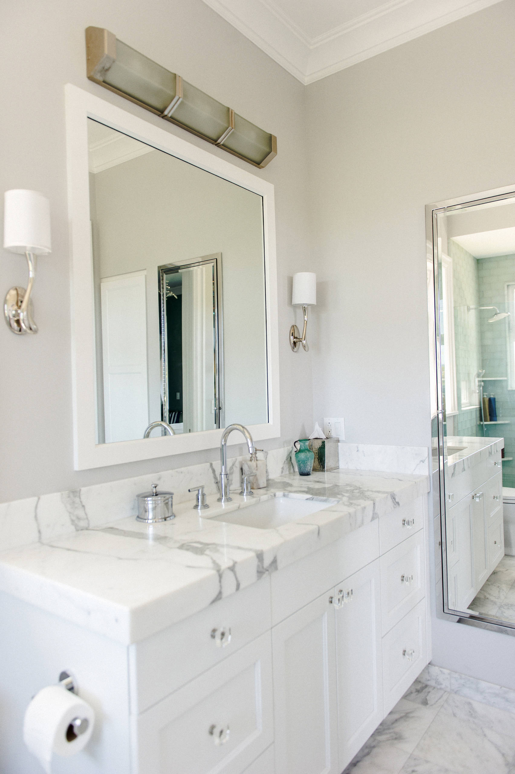 Wall paint: Dimpse, Farrow & Ball; hardware: Emtek; lighting above mirror: Allen Linear Sconce, Ralph Lauren Home