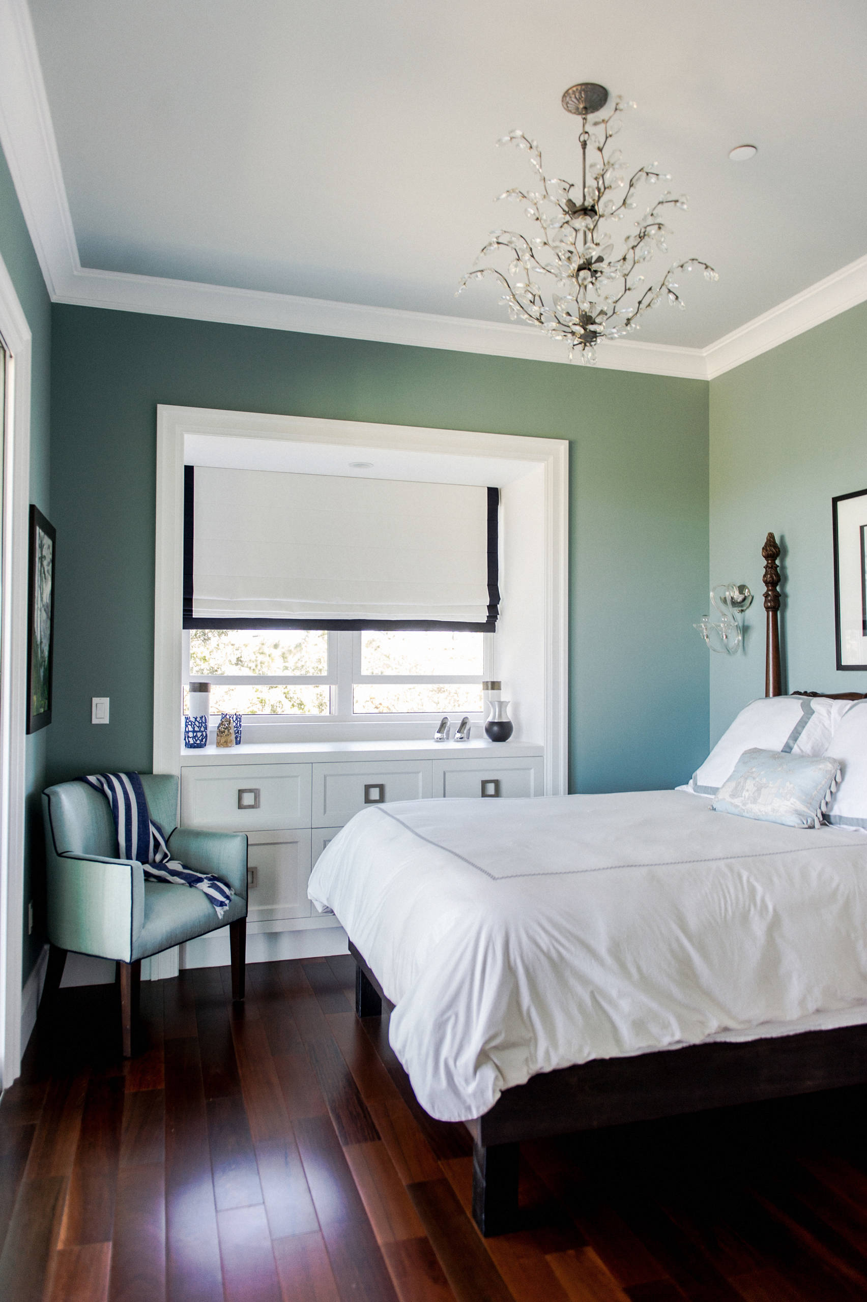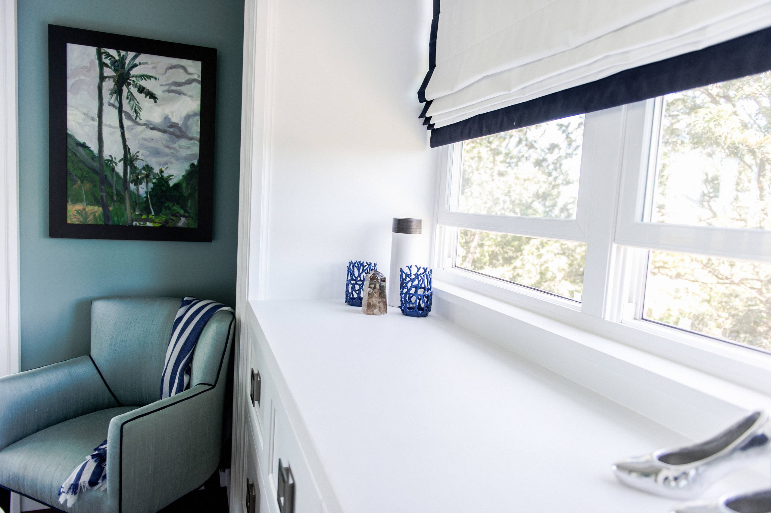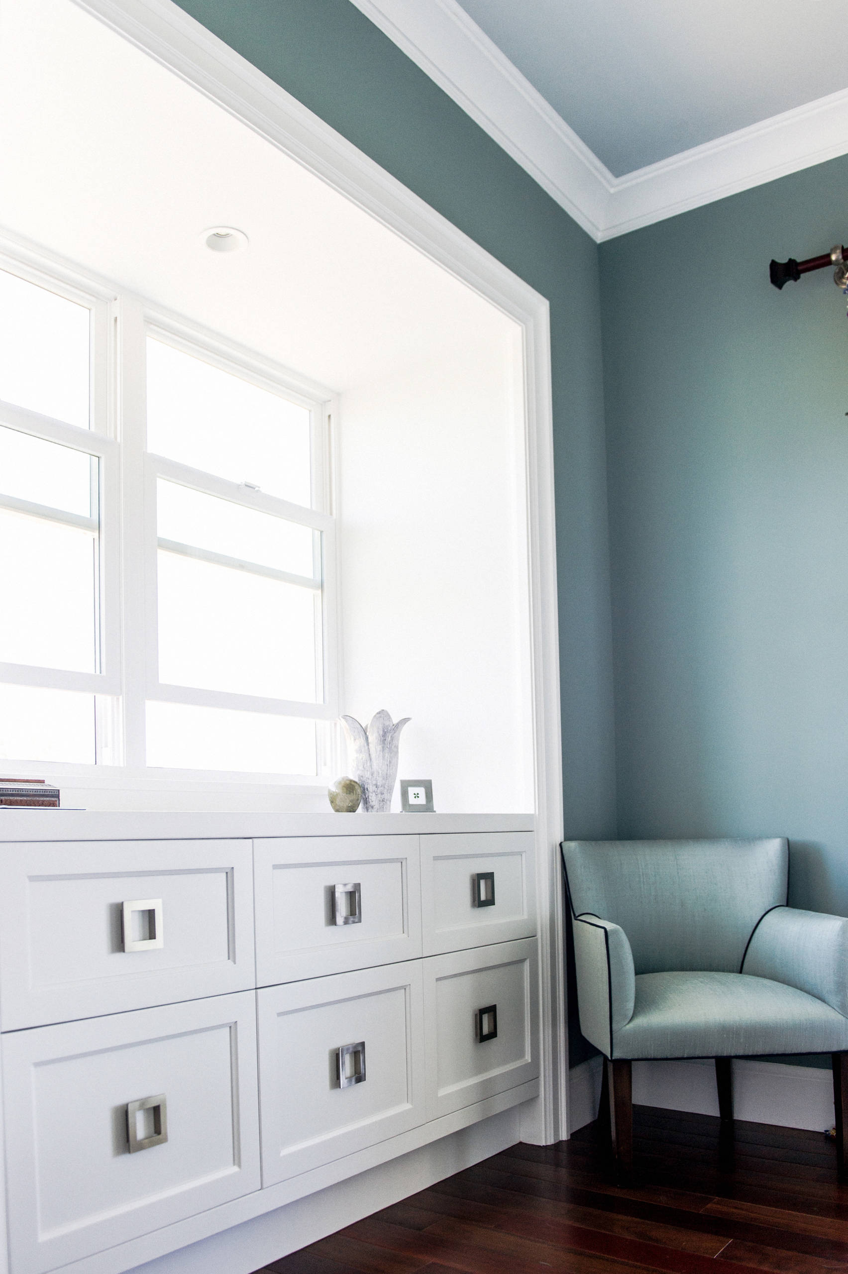 Built-ins maximize the space in the guest bedroom. Schmidt says, “It was a bay window before, with no cabinetry. Originally, our architect designed the built-in to float and the drawers were more equal in size, which was too contemporary for me. I wanted it to feel clean and timeless.”
