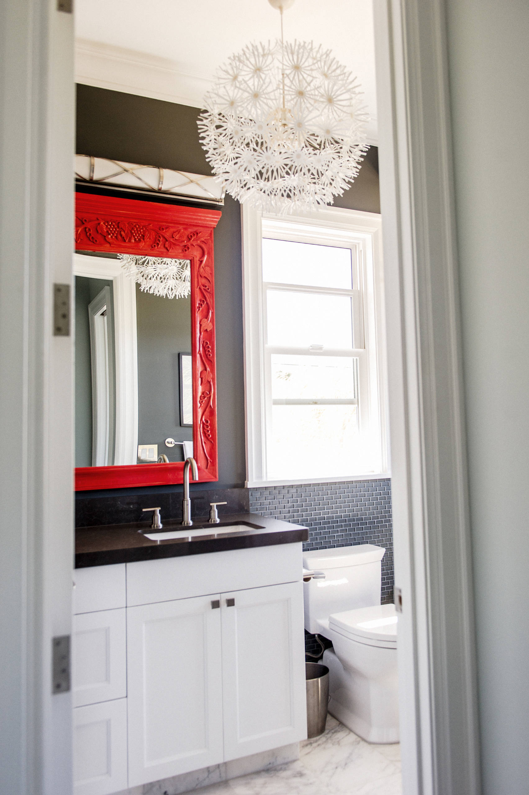 For a touch of drama, Schmidt painted a raw-wood mirror from Bali a vivid orange-red. The sleek wall sconce above is Robert Abbey’s Chase Bath Strip, from YLighting.