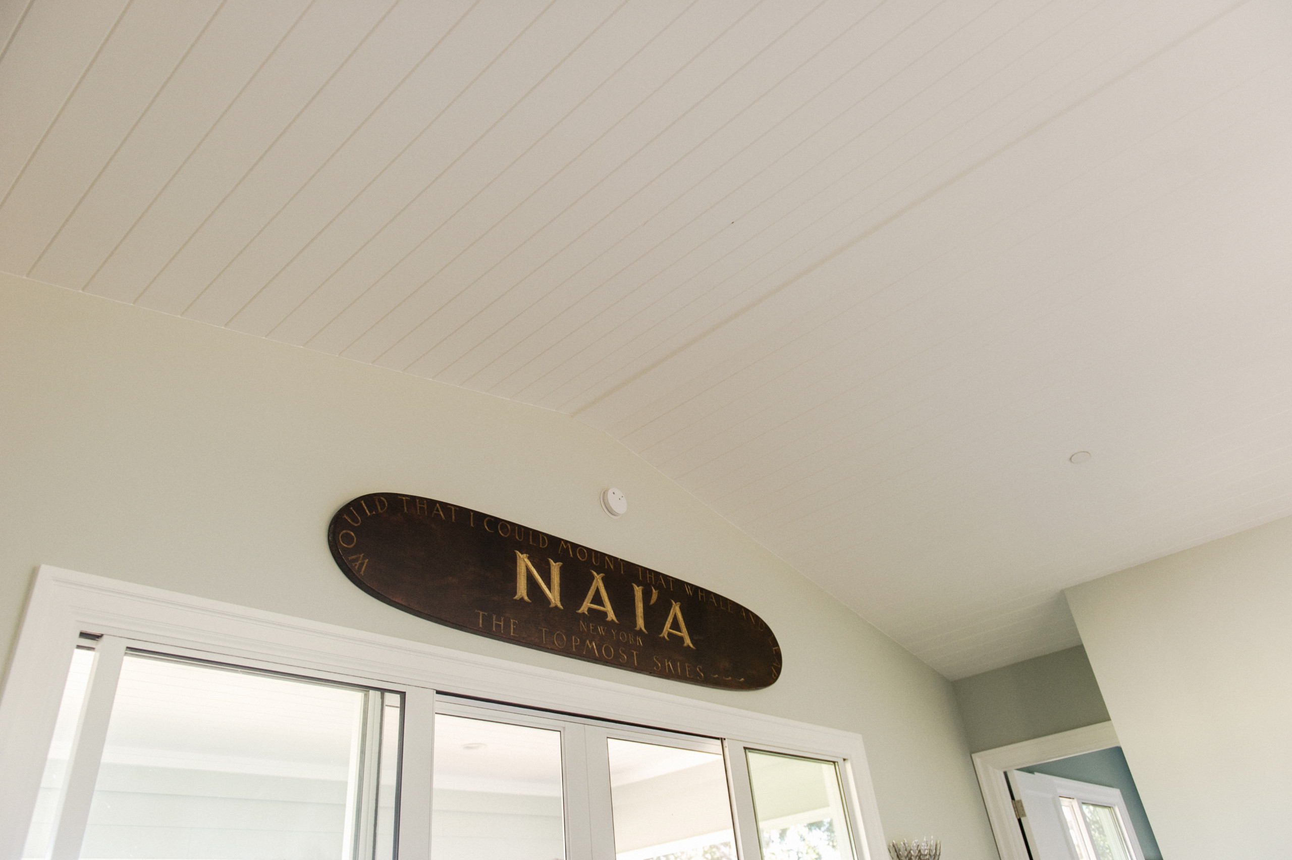 “That cool wooden sign came off my dad’s catamaran from the 1960s,” Schmidt says. “He kept the sign his whole life. He had it in New York and in the Bahamas at his resort on Harbor Island.” The sign was originally made by Roddy Choy. “Nai’a” is the Hawaiian word for “porpoise.”