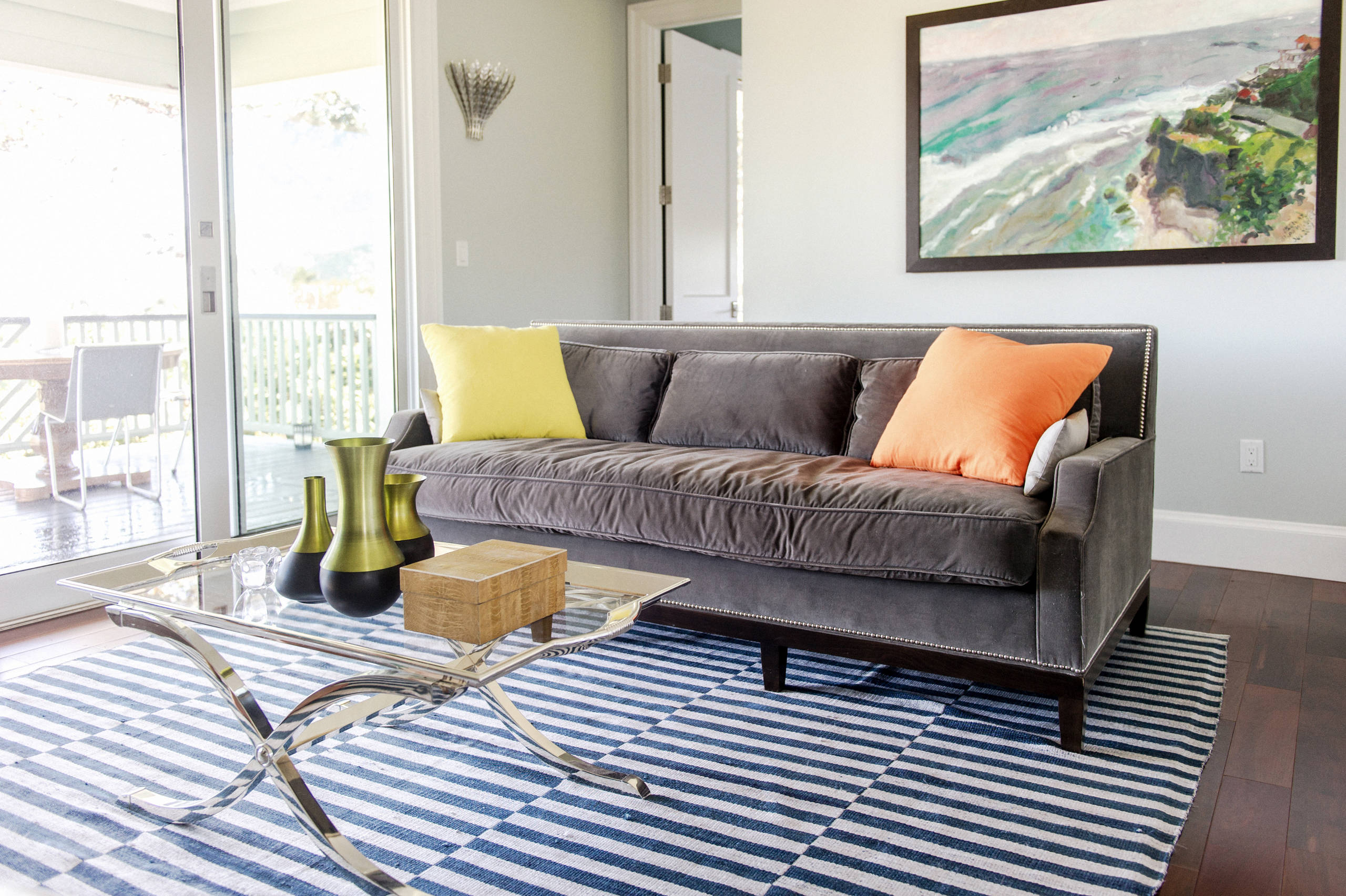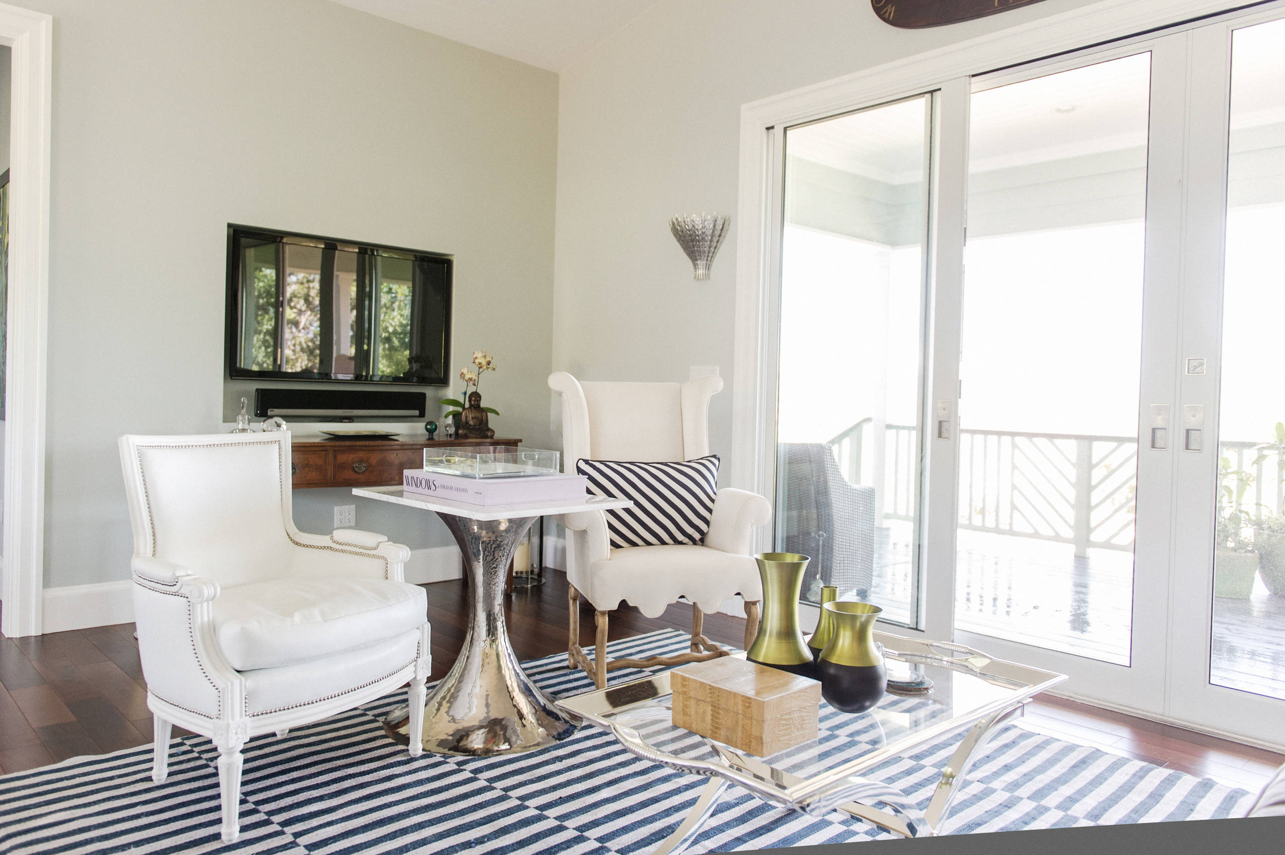 In the great room, adjacent to the kitchen, a flat-weave rug in indigo and chambray adds a touch of coastal charm. Schmidt found the couch at a thrift store in New York and had it reupholstered. The coffee table is an antique. Almost all of the furnishings were in Schmidt’s Manhattan apartment and arrived to Hawaii in a 40-foot-long shipping container.