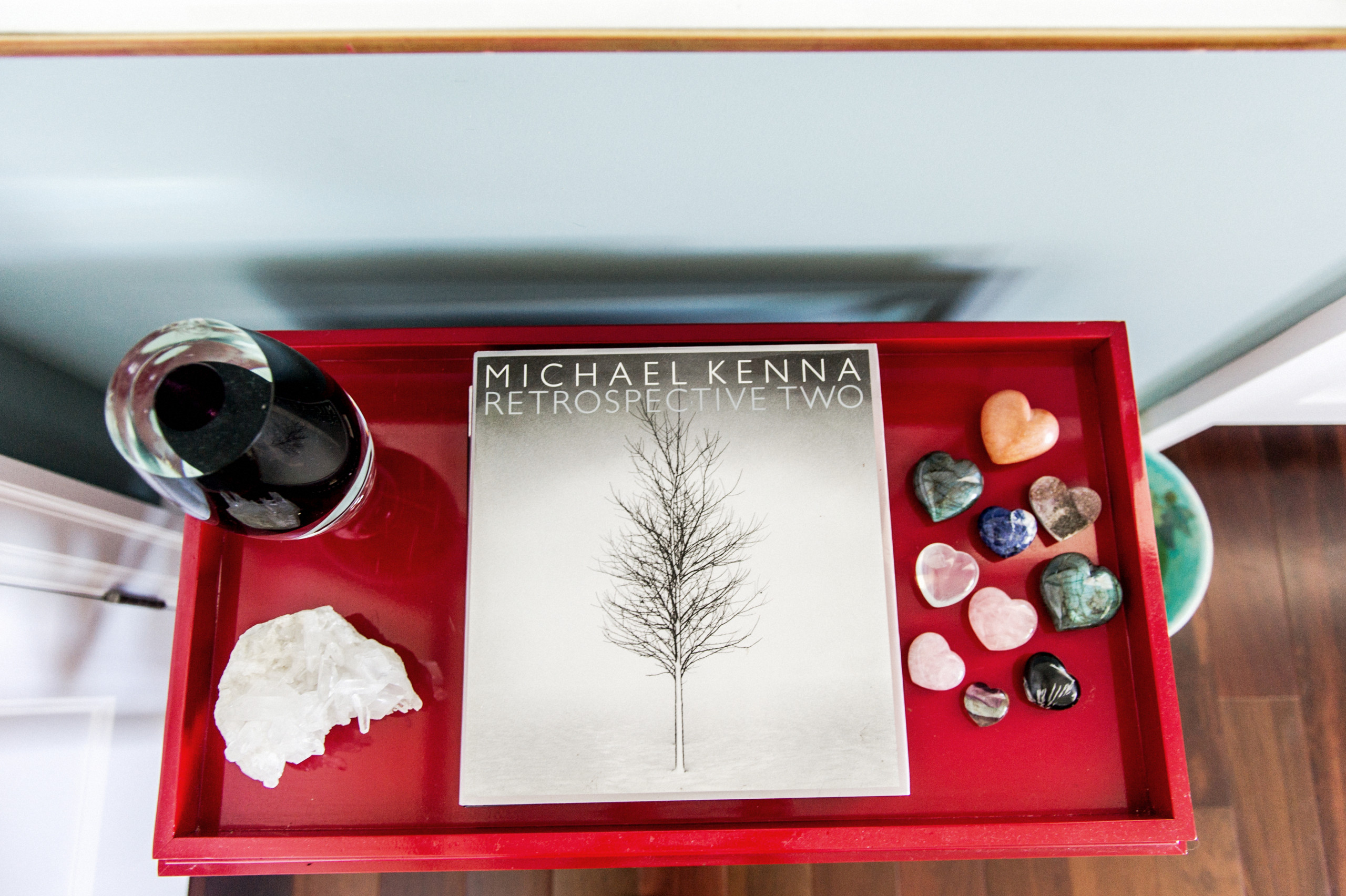 The red tray is from HomeGoods. “I took it to an auto body shop and asked them to spray it in glossy apple red,” Schmidt says. The amethyst vase is from her travels to the Czech Republic. The painting is by Laura Owens.