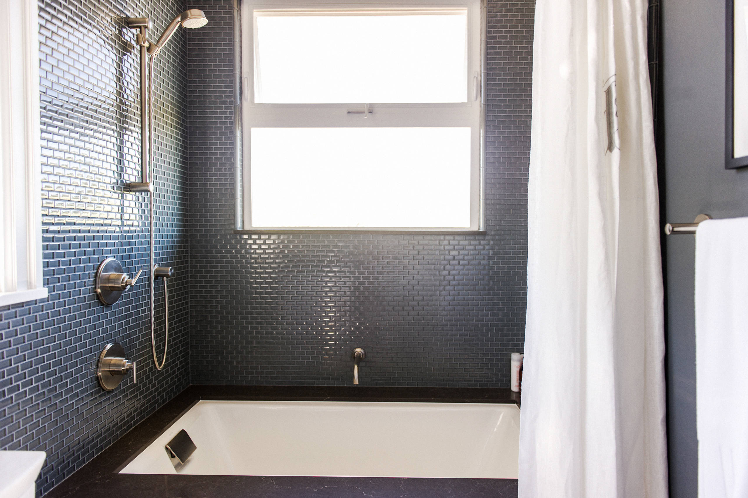 Shower, bathtub: Tea-for-Two, Kohler; showerhead: Grohe; shower curtain: linen, One Kings Lane; toilet: Toto; tile: Slate Grey, Ann Sacks; wall paint: Down Pipe, Farrow & Ball