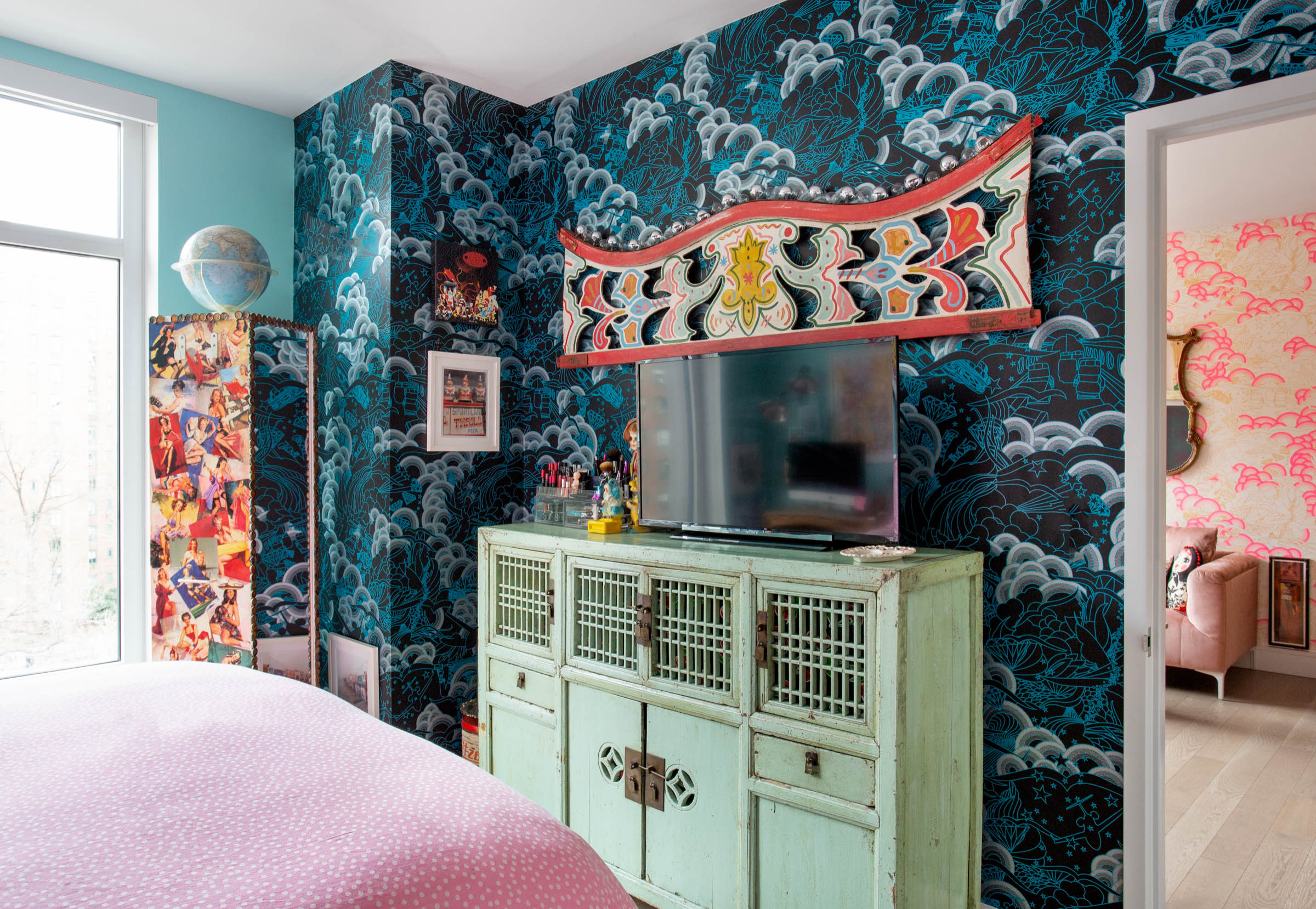 Engelbach credits her father for selecting the wallpaper in the bedroom. “When I was debating a full wall of pink and gold in the living room and kitchen and was considering this turquoise for that space, my father suggested that it was a better fit for the bedroom,” she says. “I hesitated, as I am dark-color averse. I thought having the same pattern of wallpaper in different colors was a tad lazy; however, I absolutely love it, and it matches the Chinese sideboard perfectly.”