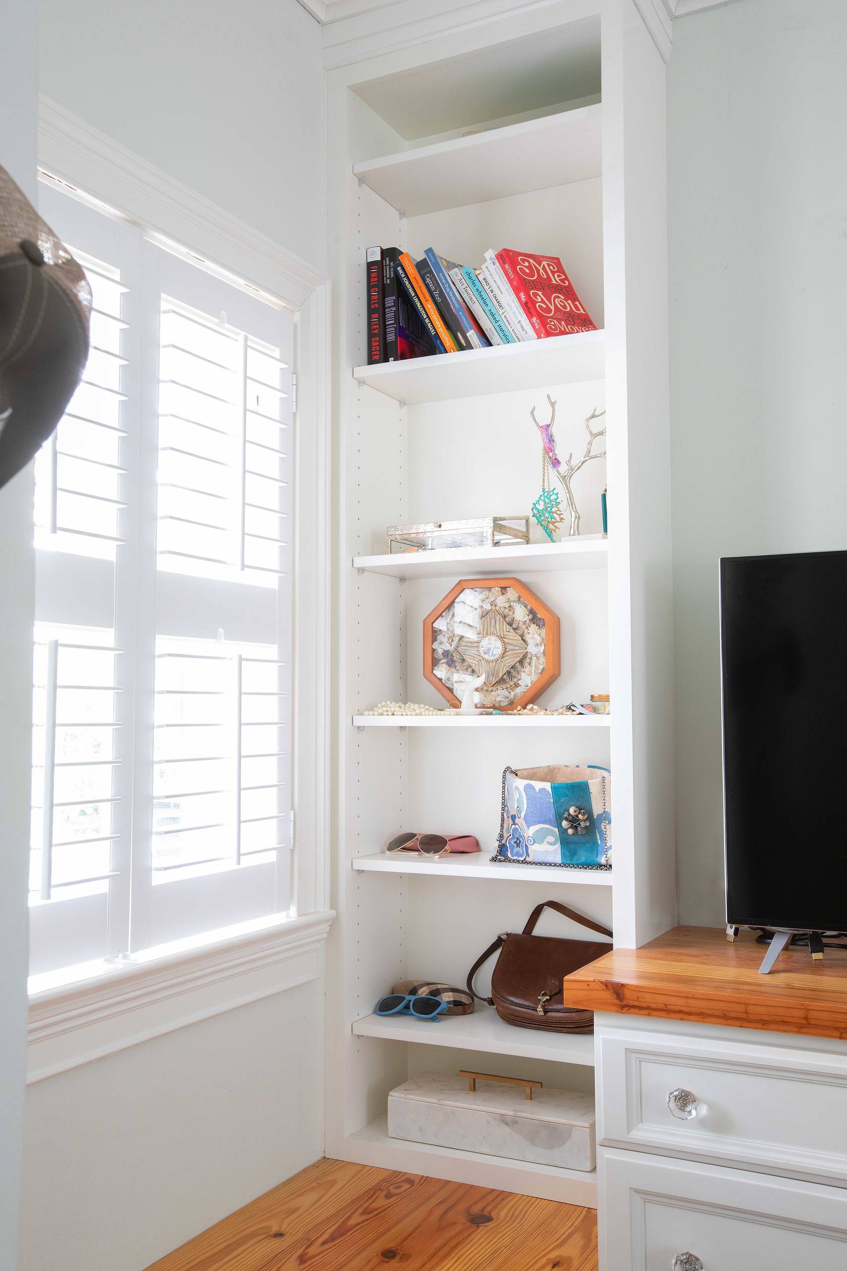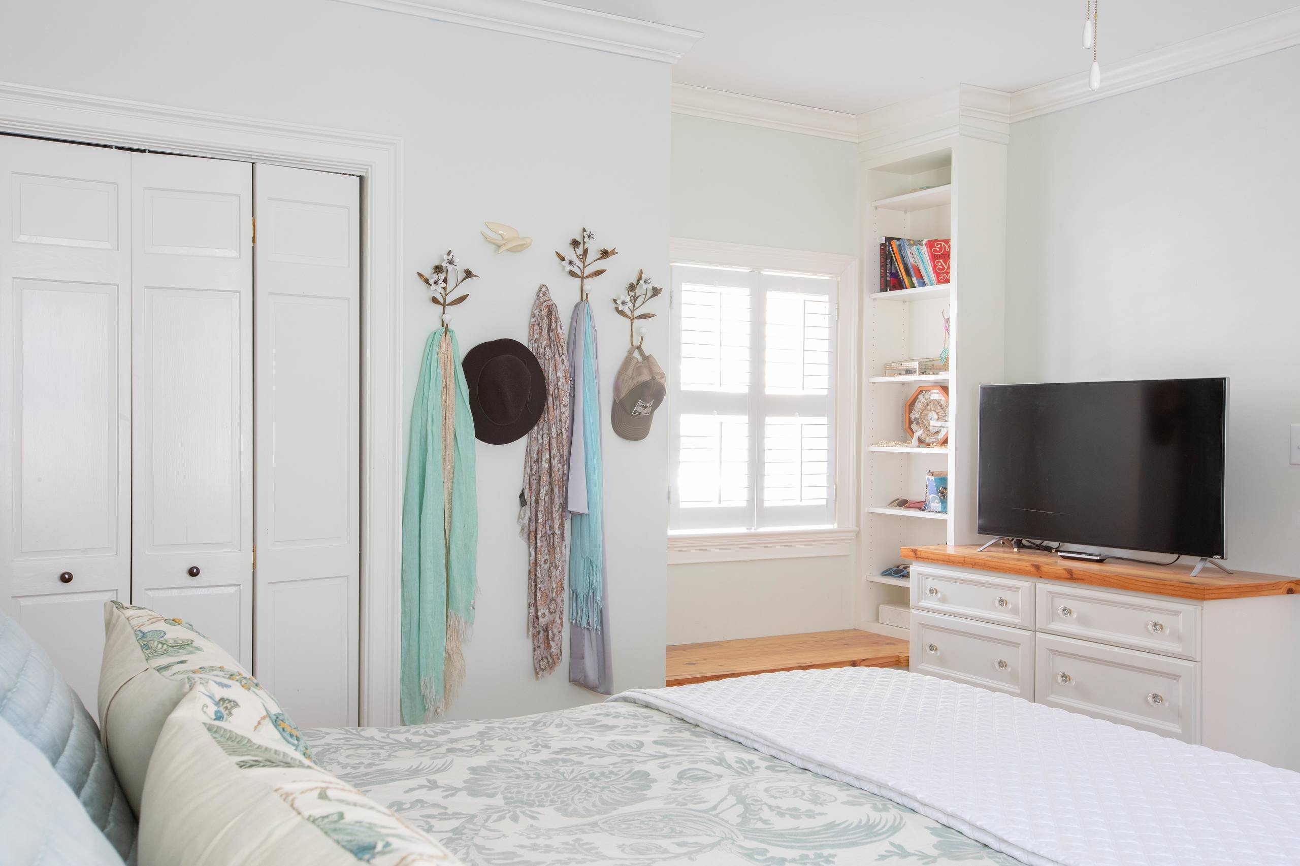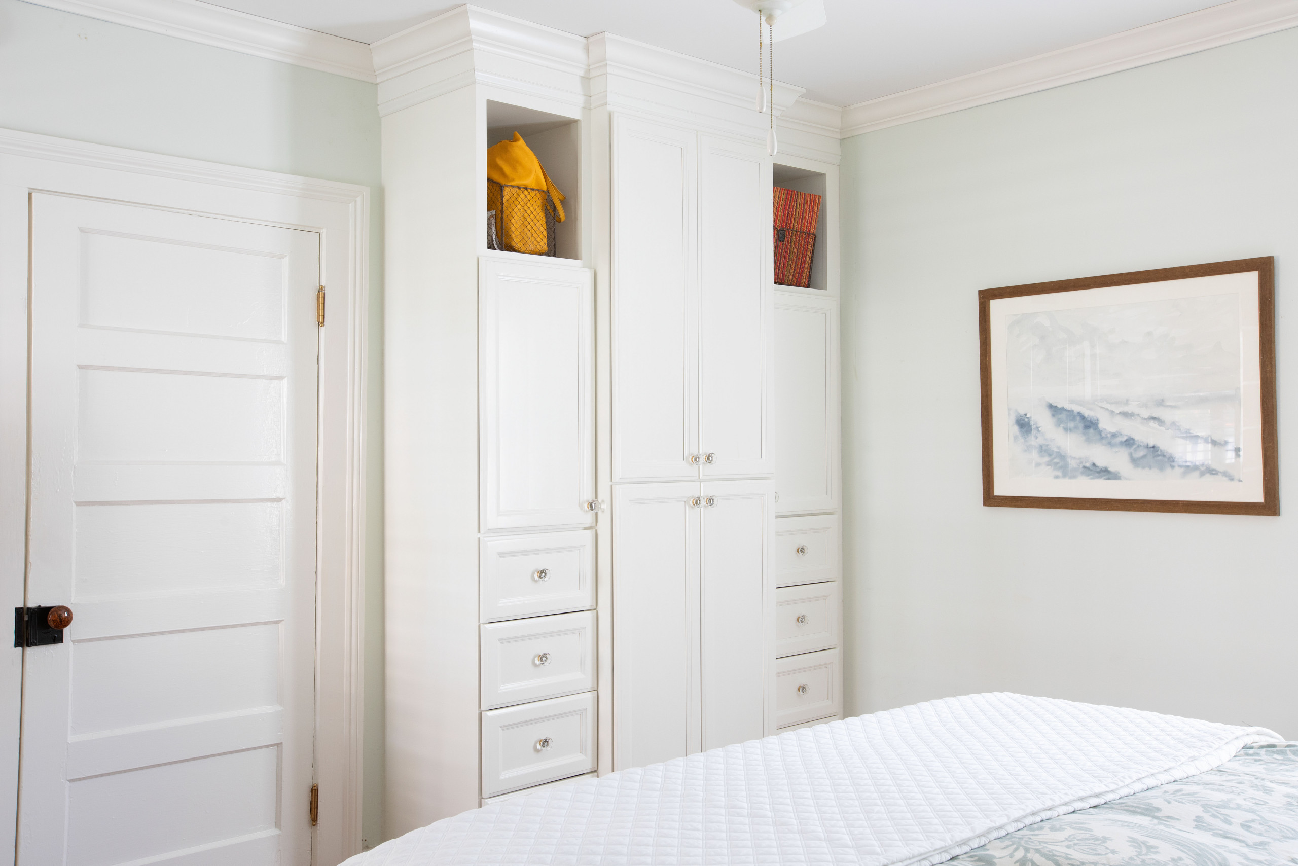 Built-ins line the bedroom walls. Temkin considers them to be a lifesaver. “I have a lot of clothes and shoes. The built-ins really help keep them organized and, I think, actually make the room feel larger and smarter,” she says.