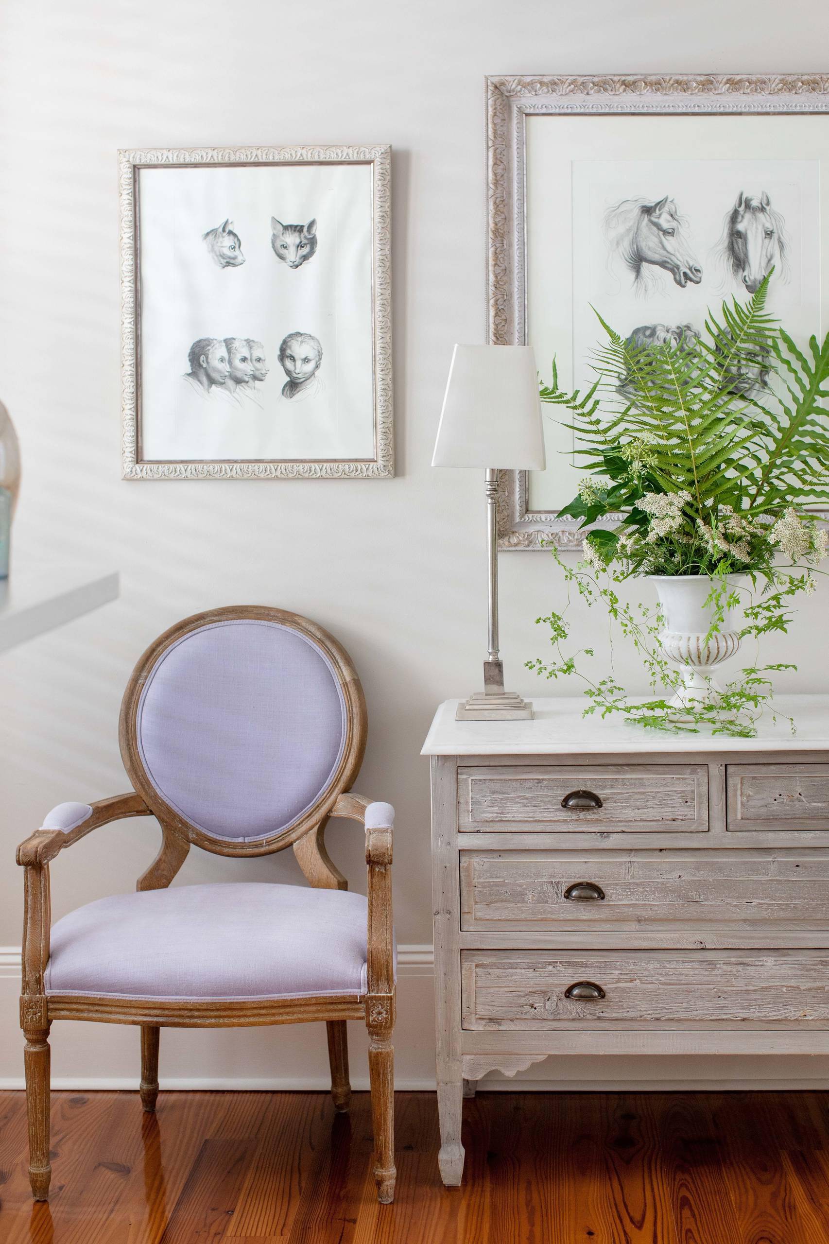 A set of reprints by 17th-century French artist Charles Le Brun hangs in the living room. This collection of artwork hung for years in the hallway outside Temkin’s childhood bedroom. “I think a lot of people find them somewhat creepy, but I think they’re fascinating and drive discussion around the emotions of humans and animals,” she says.