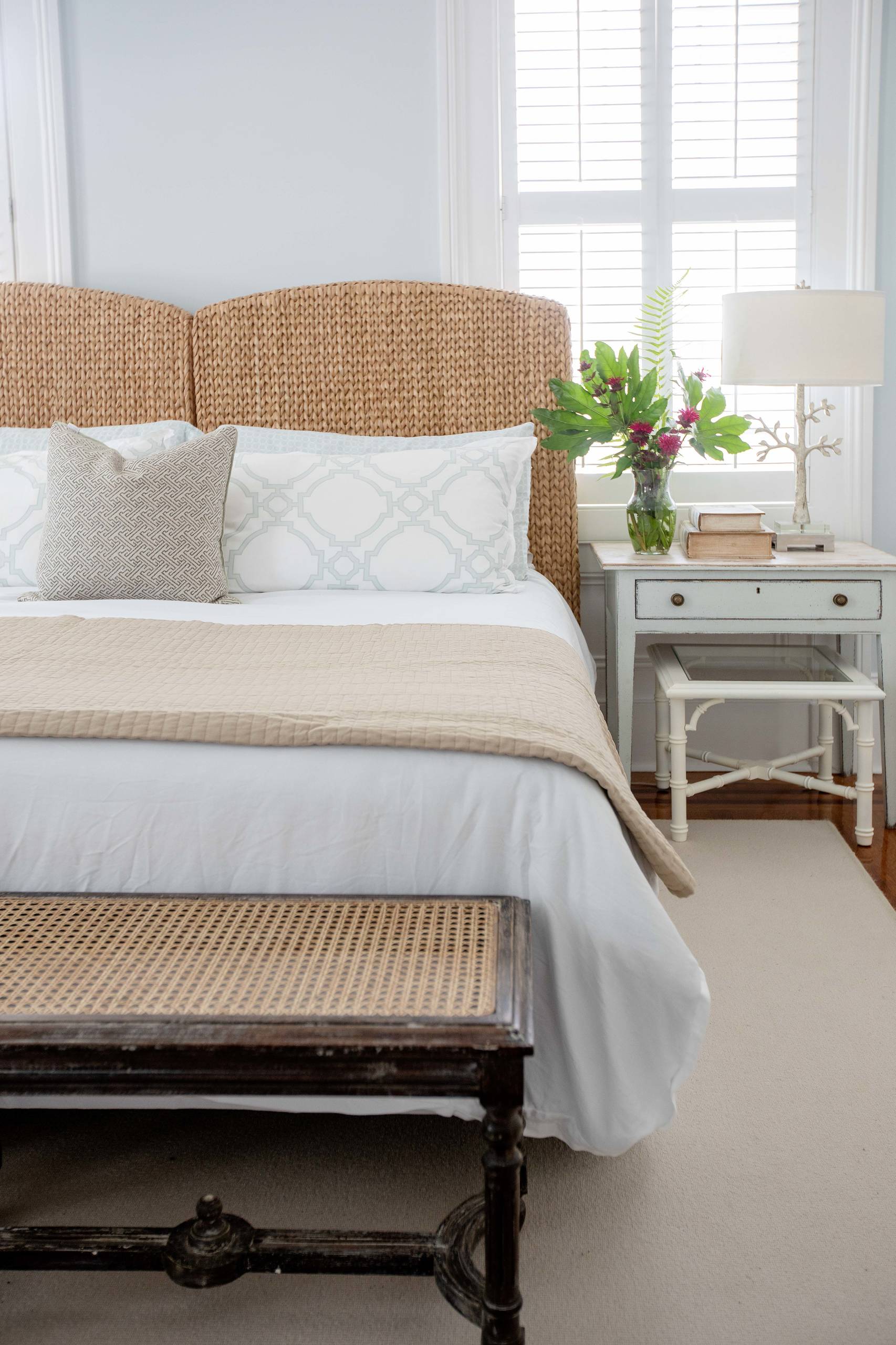 Temkin and DeBartola got creative when it came to space-saving solutions in the two-bedroom home. In the guest bedroom, the wicker headboards of two twin-size beds were pushed together to make a king bed. They can also be split apart depending on the guests. “It’s all about versatility,” she says.