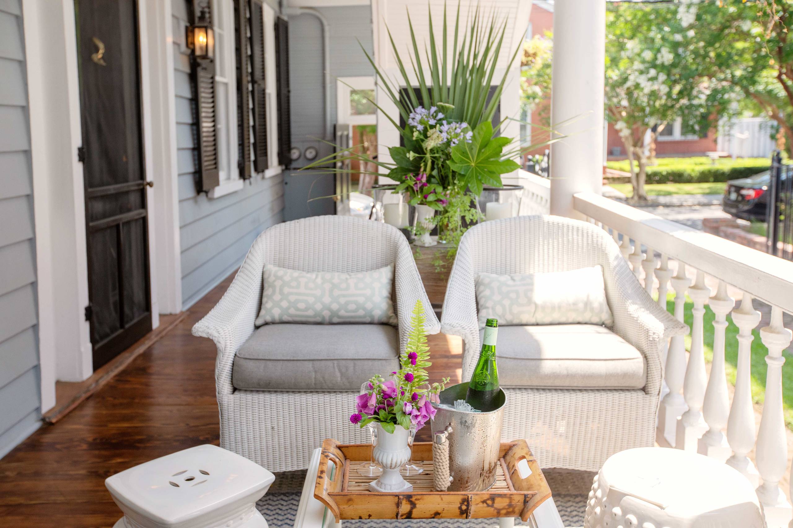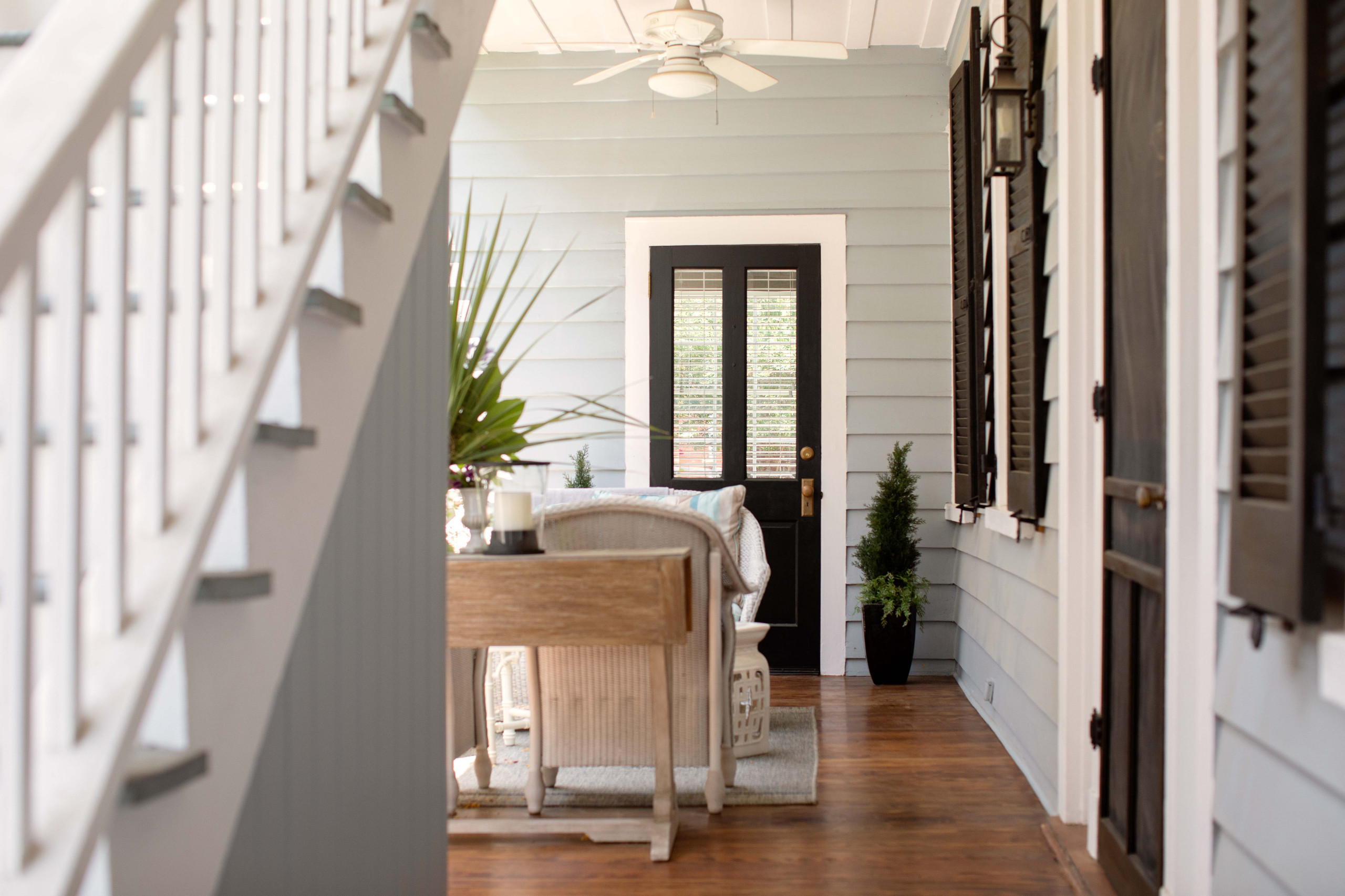 The natural-finish wood flooring is one of her favorite features on the porch, inspired by local boutique hotel Zero George. “When I bought the house, [the floor] was painted the same color as the exterior, but I saw the natural finish at the hotel and loved it,” she says. “Most Charleston singles paint the deck, so I think it makes the house unique.”