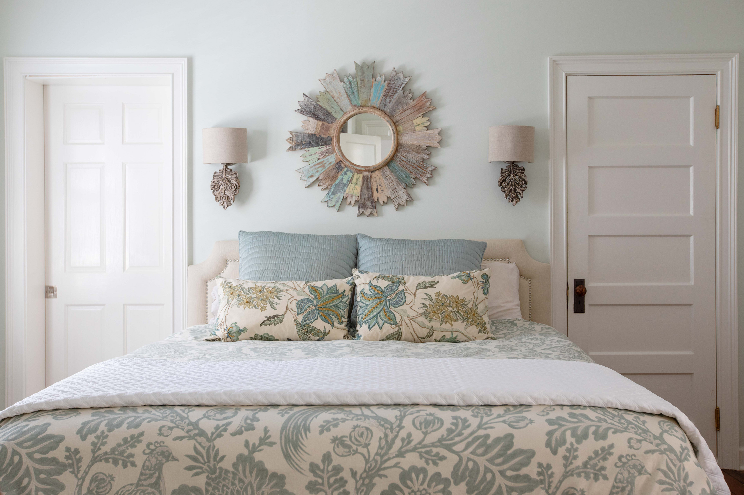 The leaf-shaped wall sconces add lighting, helping balance the absence of nightstands and table lamps, and complement the bedspread’s nature-inspired pattern.