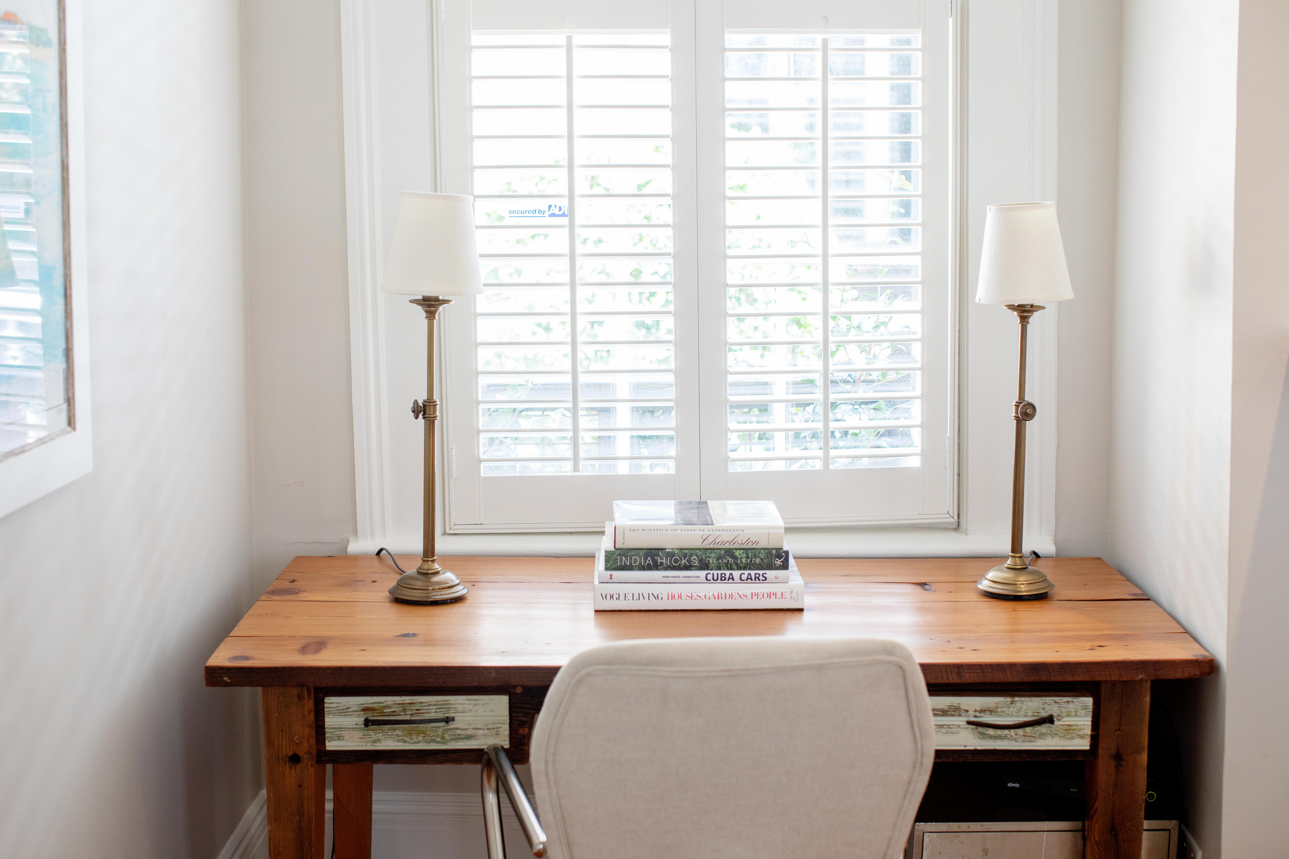 The two carved out a spot in the living room for a small custom desk where Temkin can focus on her schoolwork. The desk was one of her first purchases for the home, since she was spending so many hours writing her dissertation. She designed the desk and worked with local woodworker Capers Landrum Cauthen of Landrum Tables to build it.