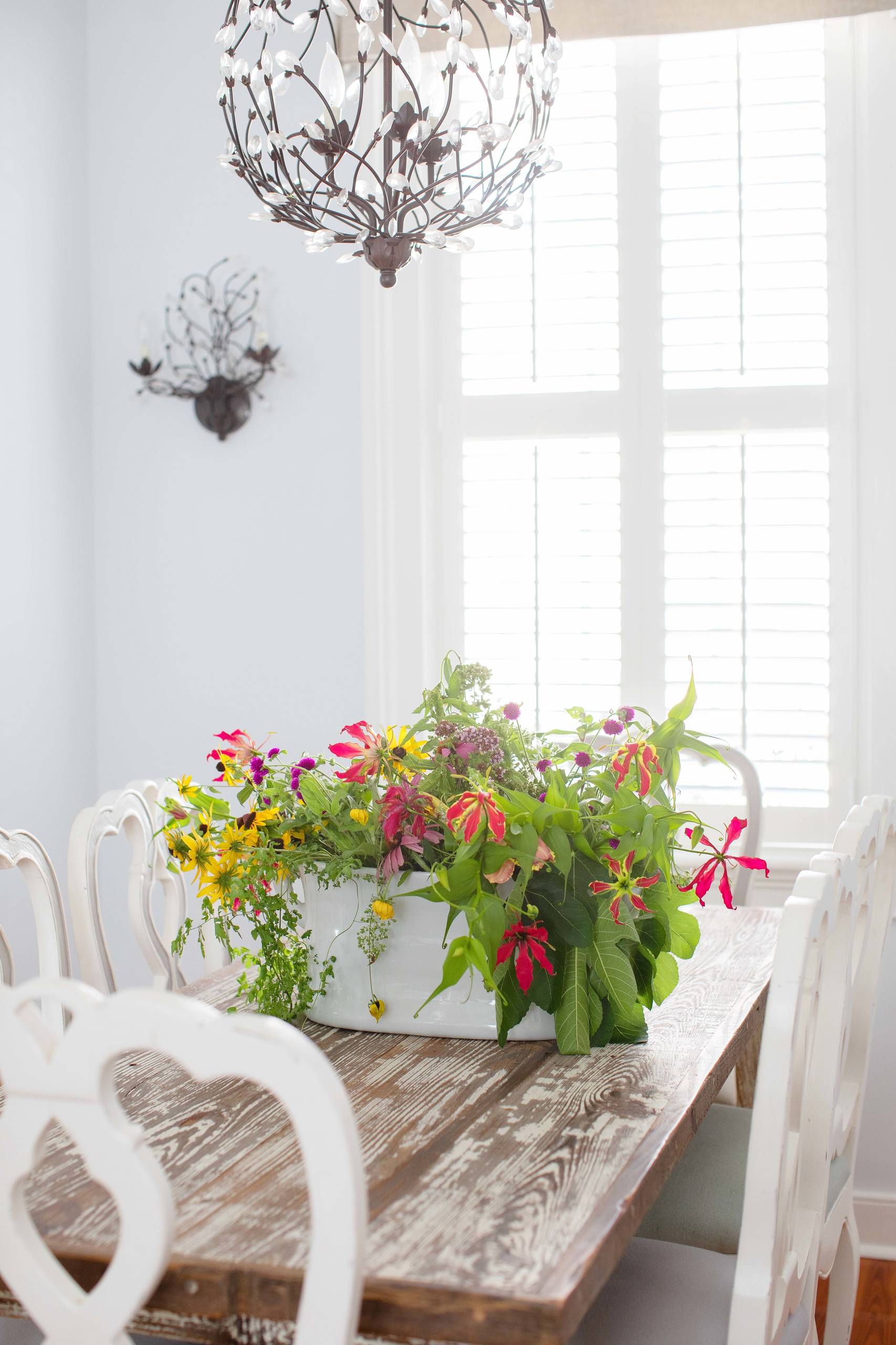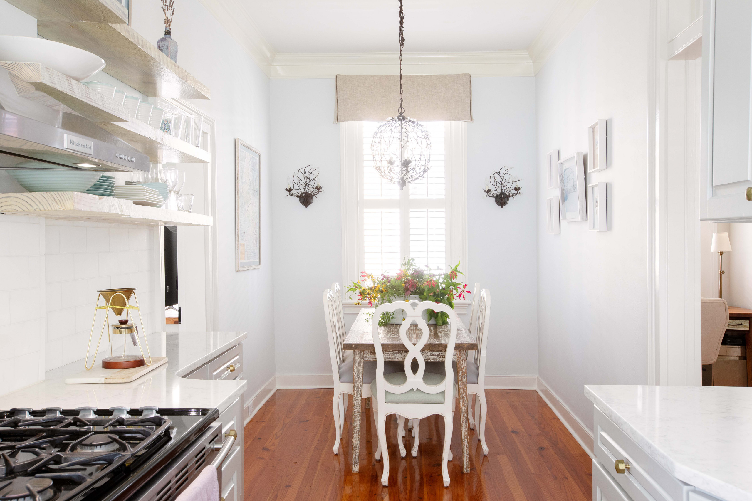 The table and the whitewashed open shelves, as well as other driftwood-inspired pieces throughout the home, add to the coastal-inspired feel.