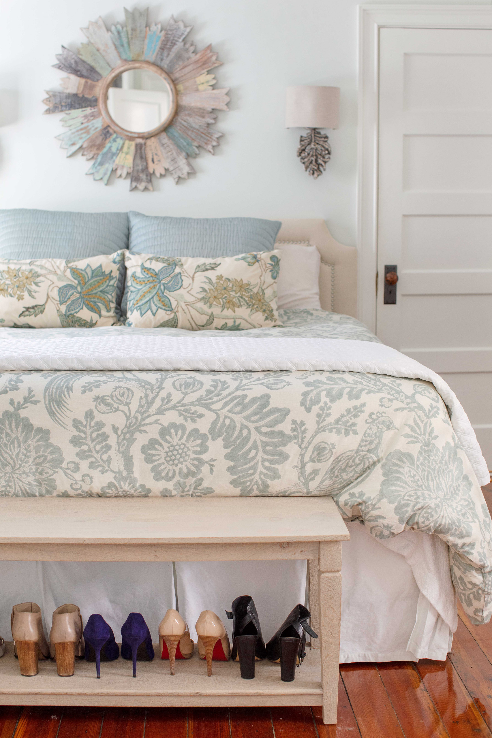 Temkin makes clever use of a bench at the foot of her bed to display and store her shoe collection.