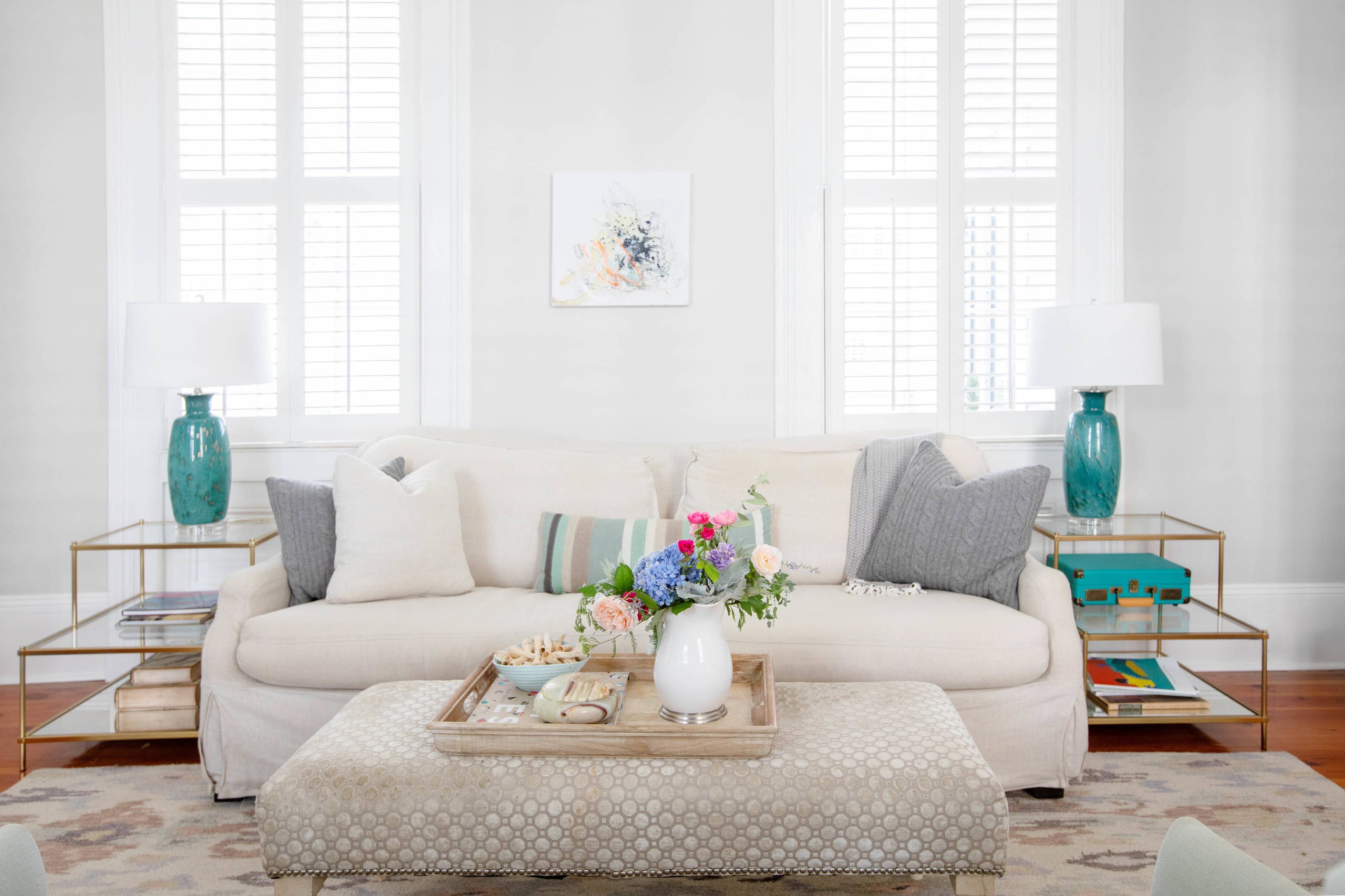 Temkin worked closely with her interior designer friend Taylor DeBartola to decorate and furnish the home using an ocean-inspired palette. A coastal feel dominates the interior, with light natural wood tones and blue decor accents. The homeowner describes her style as “coastal but not beachy.” The look derives from the colors and textures of the sea but is not overtly beach-themed.