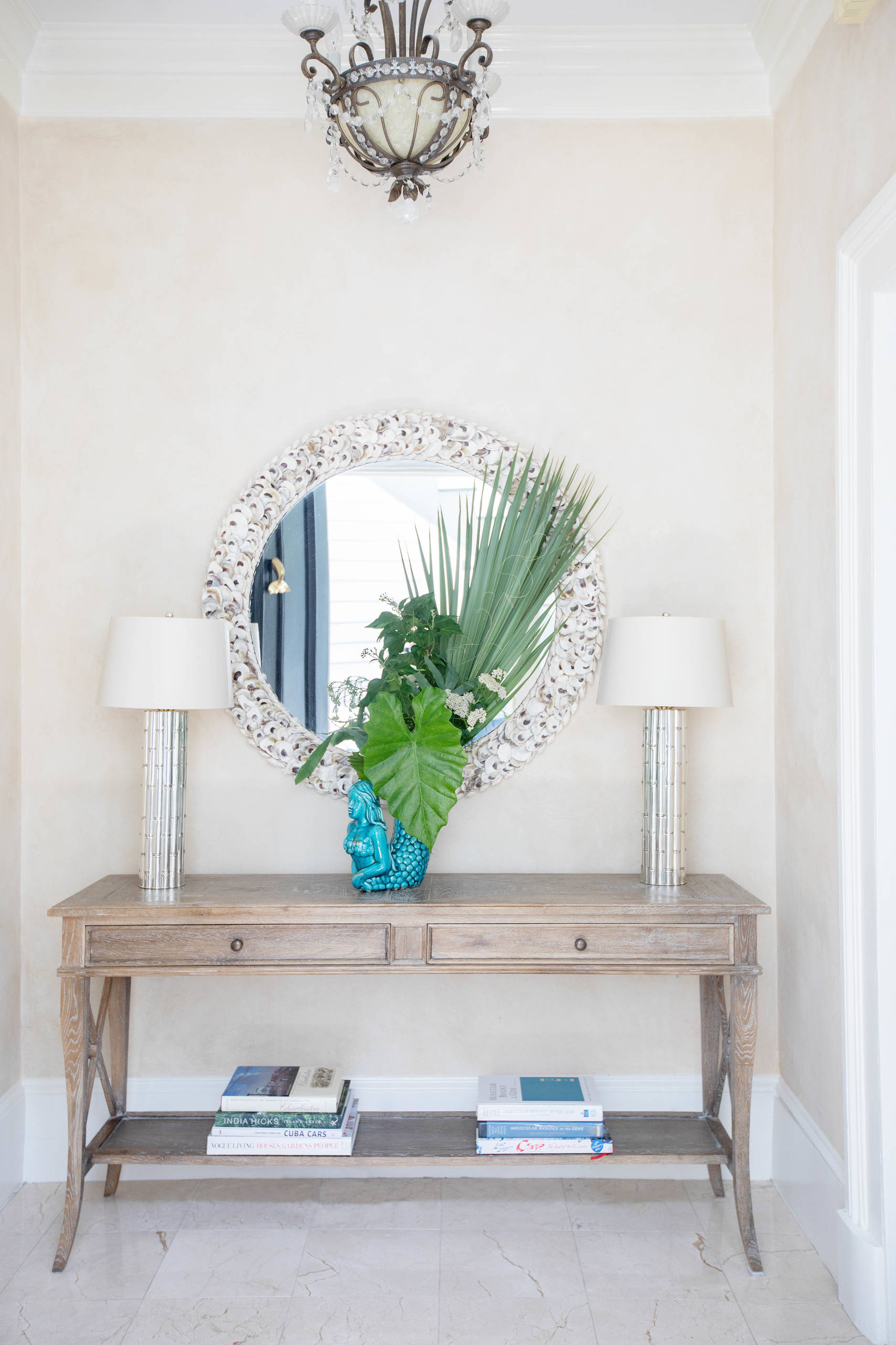 Throughout the home are mermaid decor accents, as seen with this blue vase on a vintage console in the entry. “I’ve always loved the ocean, and I guess the mermaid thing really sort of evolved naturally,” Temkin says. She adds that DeBartola nicknamed the house the Mermaid Lounge, “and that sort of became my personal brand.”