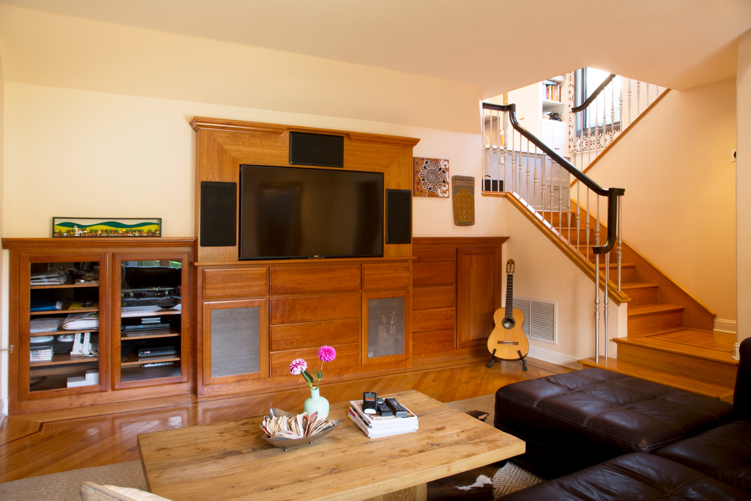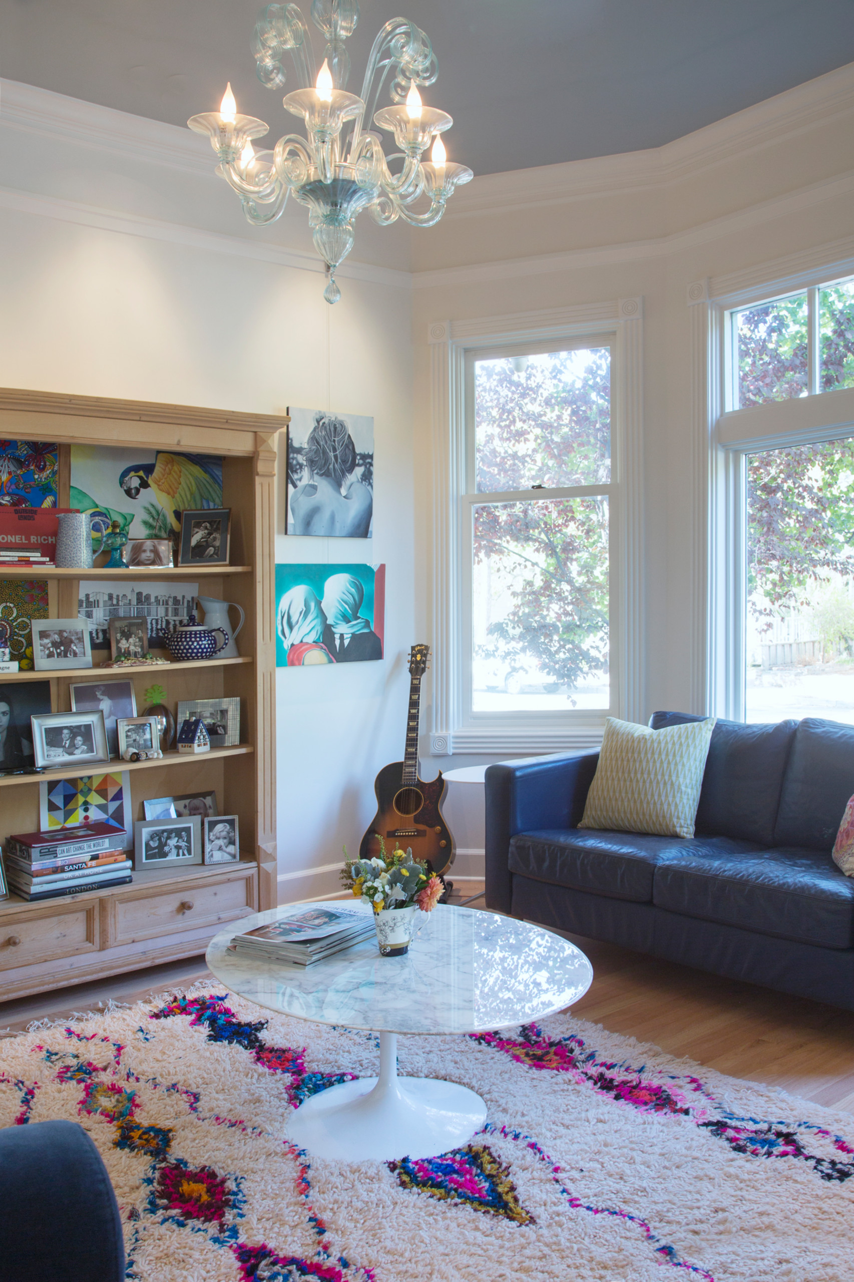 The parlor in the front of the house was often overlooked prior to the remodel, but now, with the improved flow, the family uses it much more. The well-loved Ikea leather sofa is a favorite place for Cody to nap and look out at the street filled with other Victorians. “I like to use the space to read the newspaper on Sunday mornings. In the evenings, this is also a space to entertain with drinks. Julia practices clarinet in here too,” Martha says.