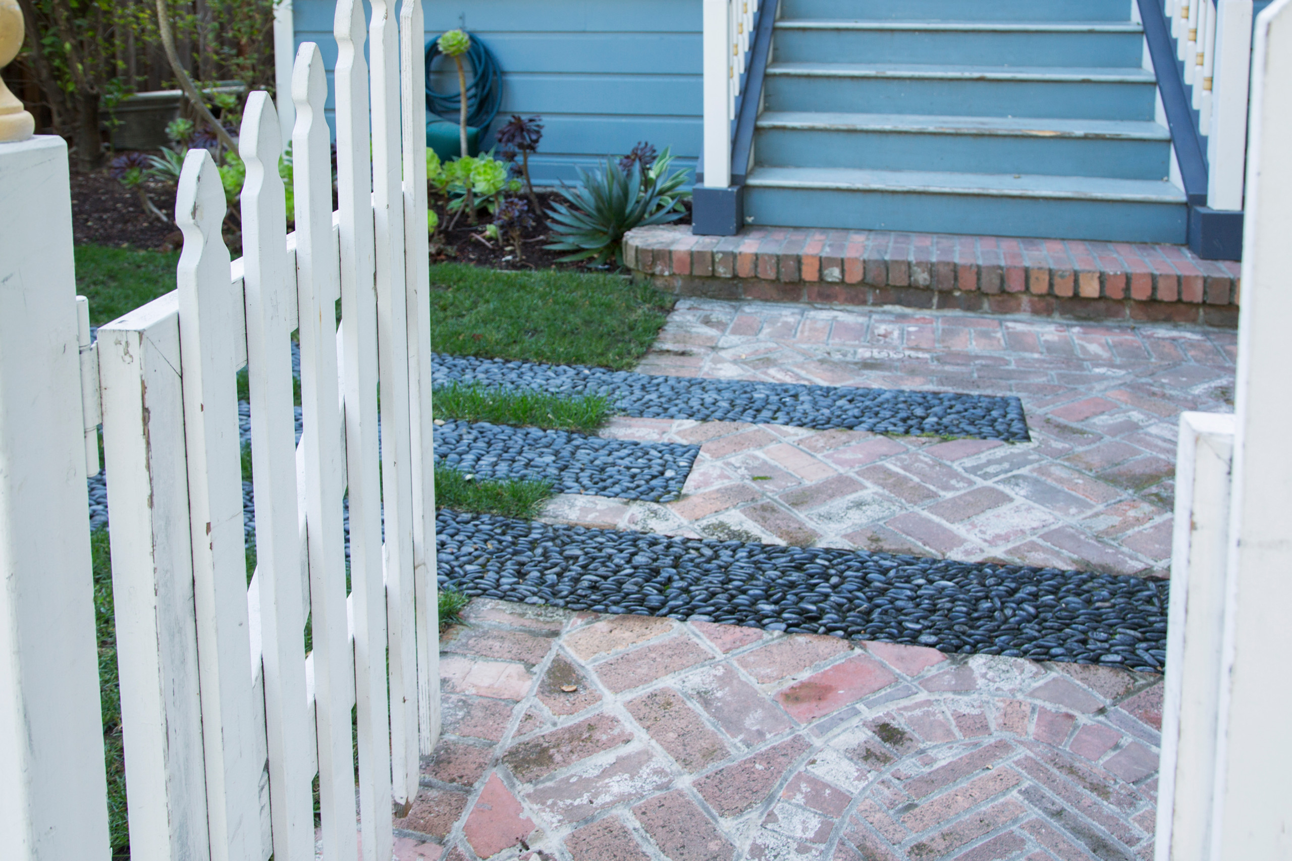Embedded stones add a modern touch to an existing traditional brick pathway at the front of the home.