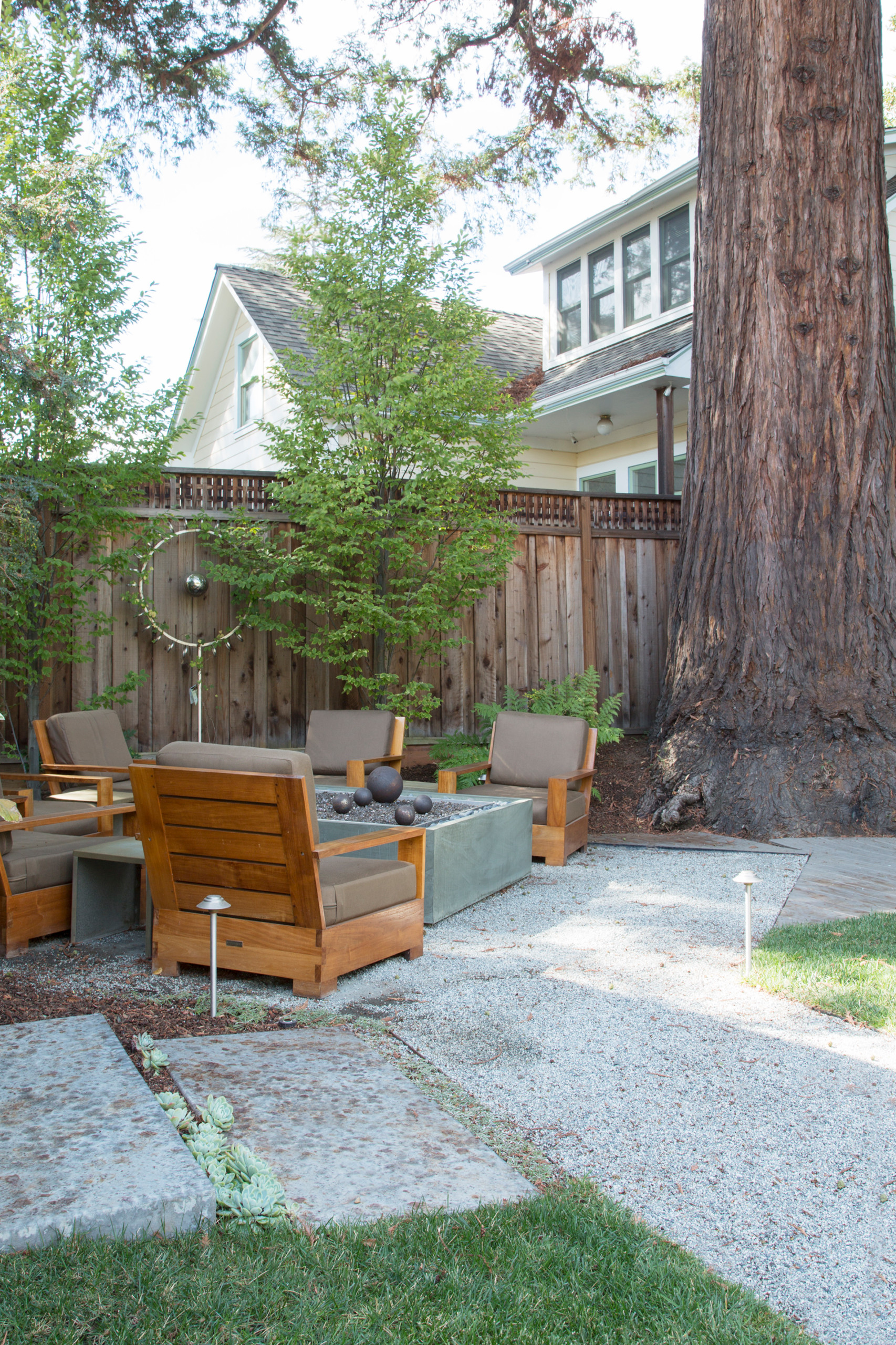 A century-old redwood in the backyard offers plenty of shade on hot summer days. “We have it trimmed every few years by local arborist Skip Patten. We strategically placed our fire pit and seating area under it, and we have the canopy lit up at night. It is really beautiful to sit under,” Martha says. “The downside is that after a storm, our yard is strewn with redwood debris.”