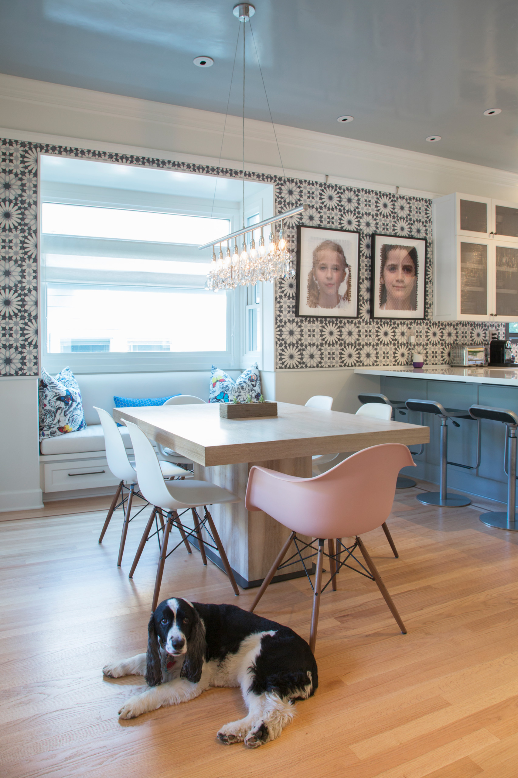 The bay window was added “to make the space appear larger and lighter, and to add the possibility of a two-person seat at one end when the custom table is extended and pushed up to the bay window banquette,” Martha says. Graphic designer J.W. Fry created the woven portraits of the couple’s daughters in 2006.