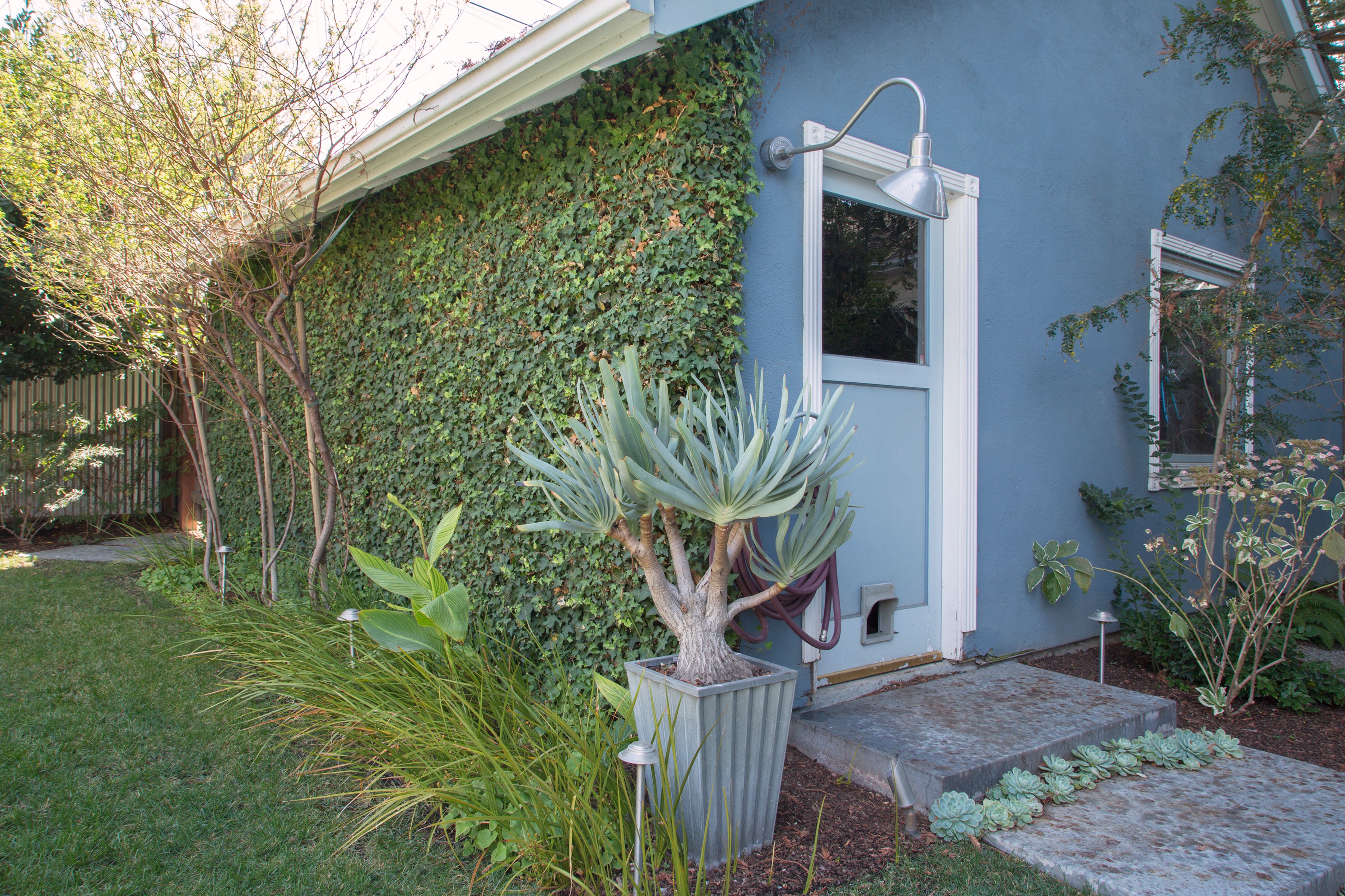 The front does not feature a driveway; the ivy-covered detached garage is accessed from a rear alley. Succulents are planted in front of each stair tread on the path that leads from the garage to the house.