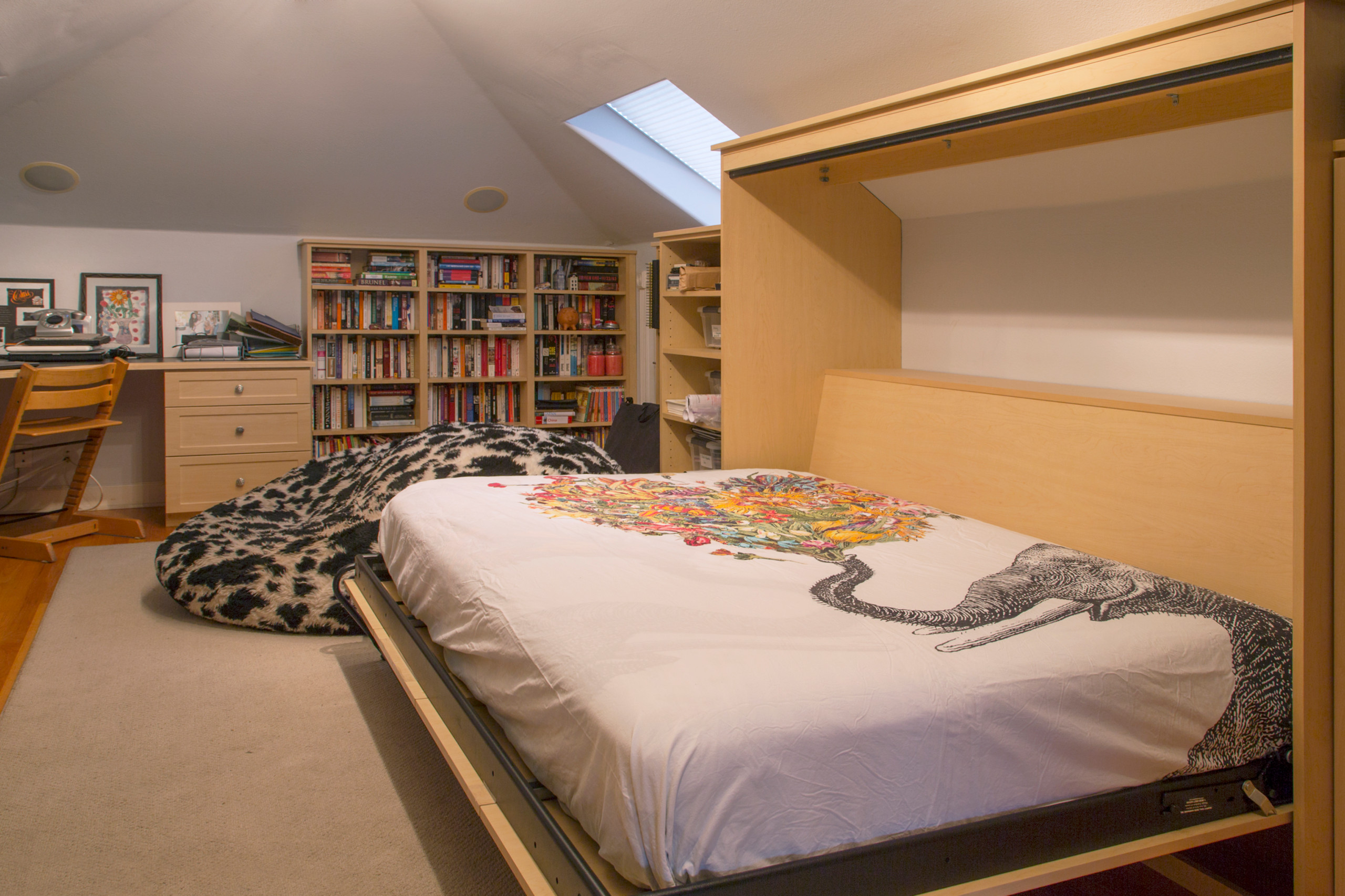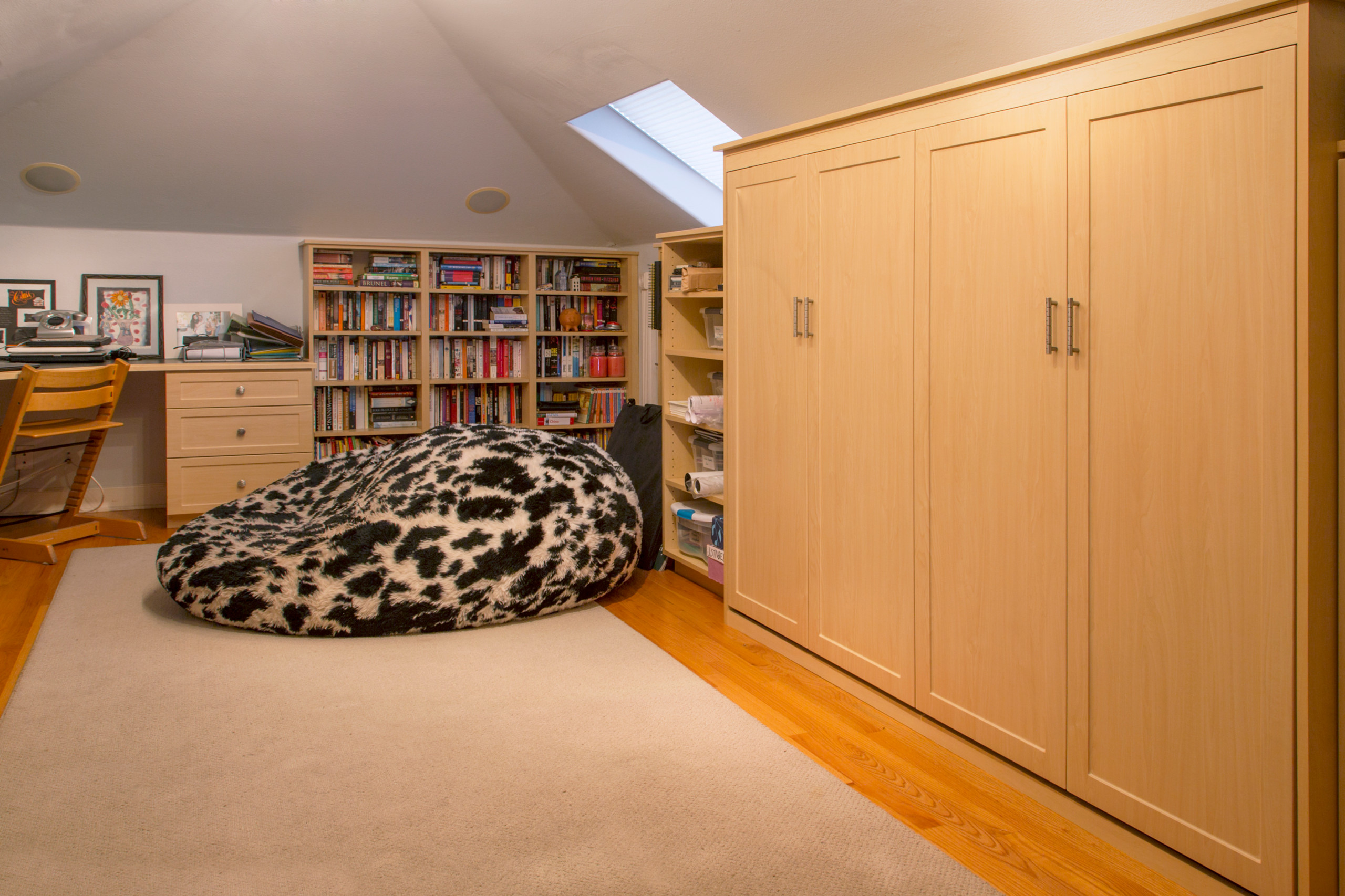 Above the master bedroom is a loft used as a guest space and home office. Custom cabinetry installed by a company in Santa Cruz (now closed) lines this space. The oversize beanbag from London is another favorite spot for Cody to sleep.