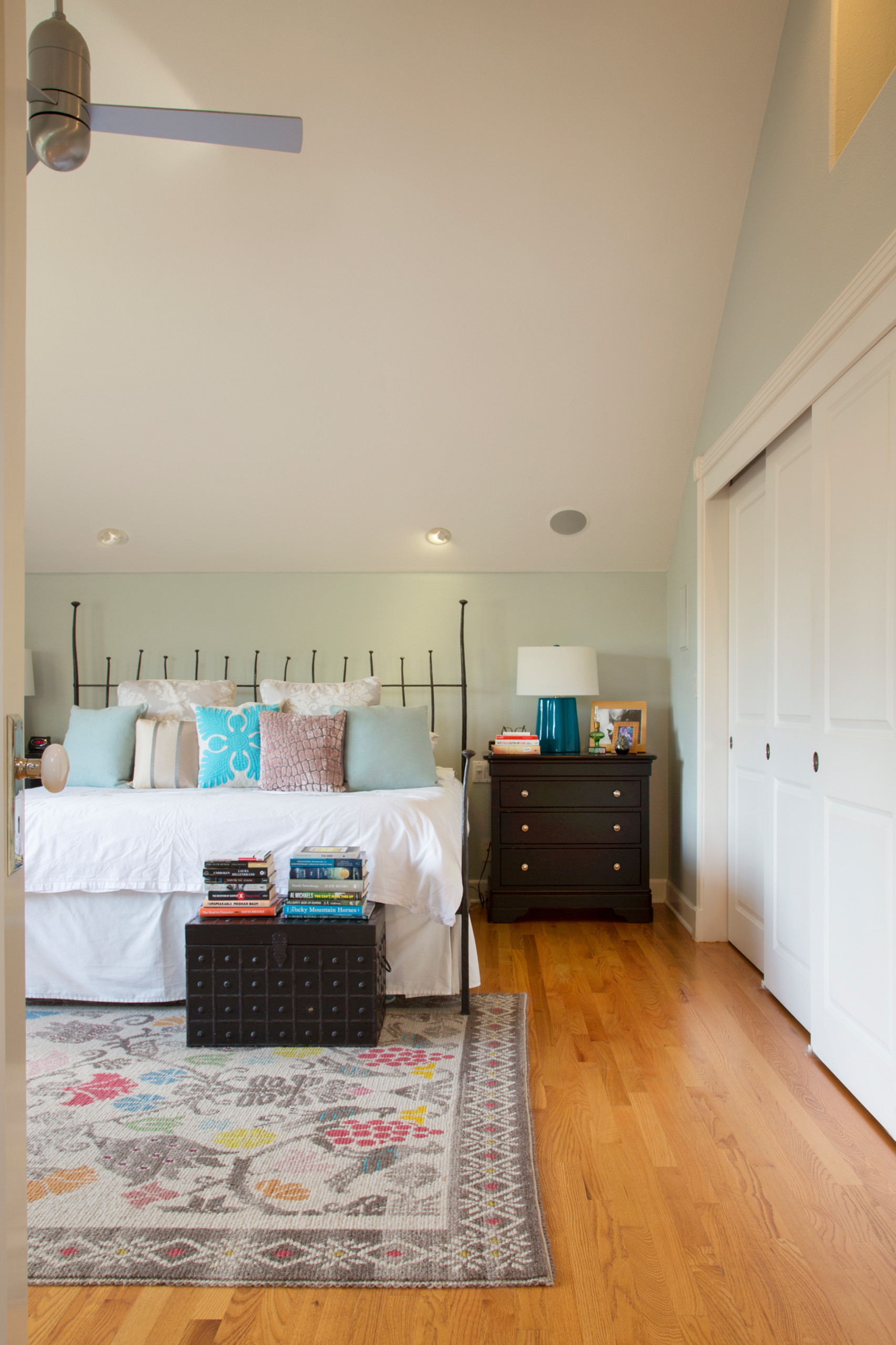 The couple’s master bedroom has a nice view of the Santa Cruz Mountains and includes a handmade area rug they bought in Sardinia. The accent pillow in the middle of the bed is a memento from Oahu, Hawaii.