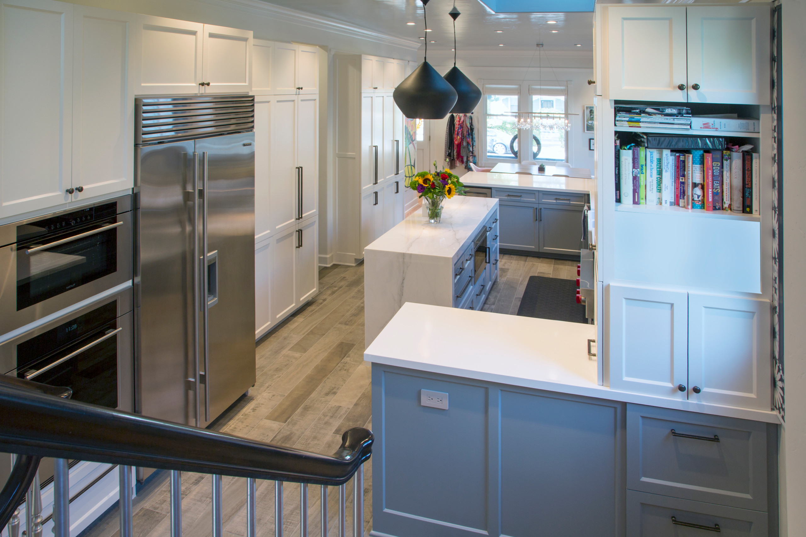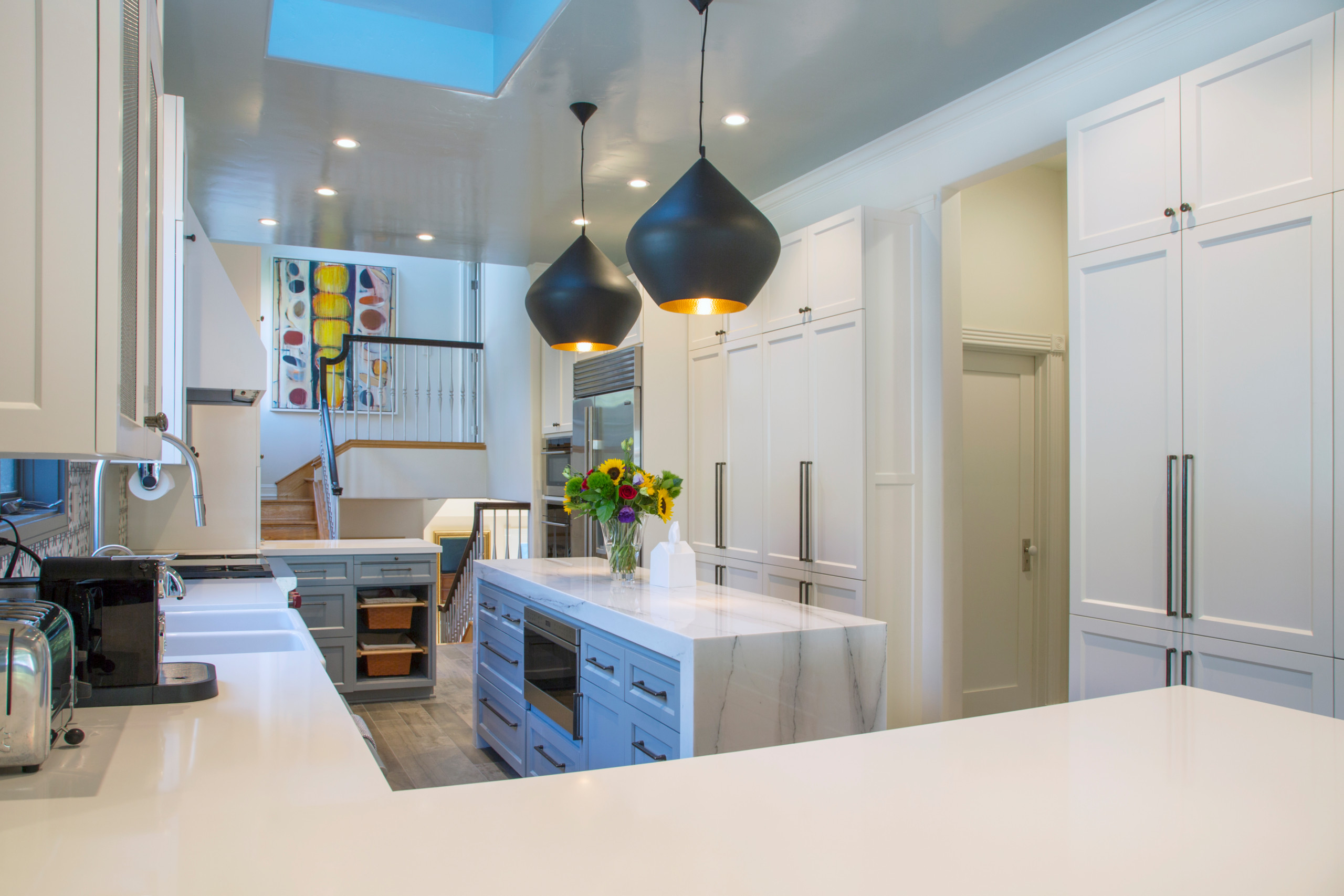 “I wanted the rest of the kitchen to have a more modern vibe, thus the linear hardware, waterfall-edge marble island, high-arch faucet, oversized pendant lights and PentalQuartz counters,” Martha says. The Shaker cabinets, farmhouse sink and picture rail are more in line with the original Victorian architectural design features.